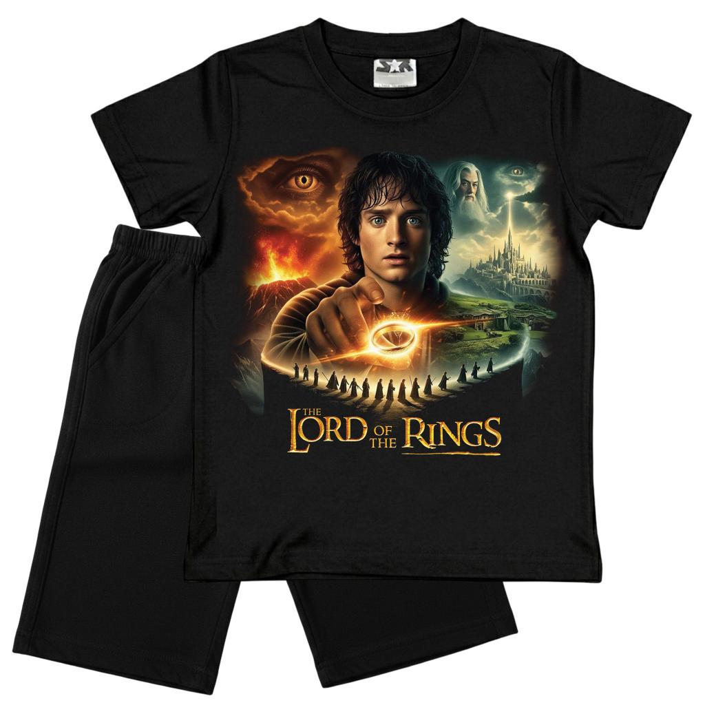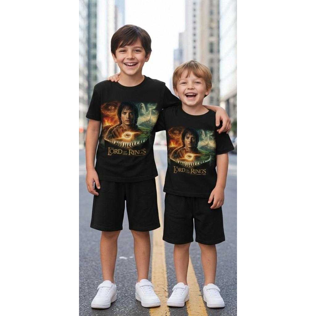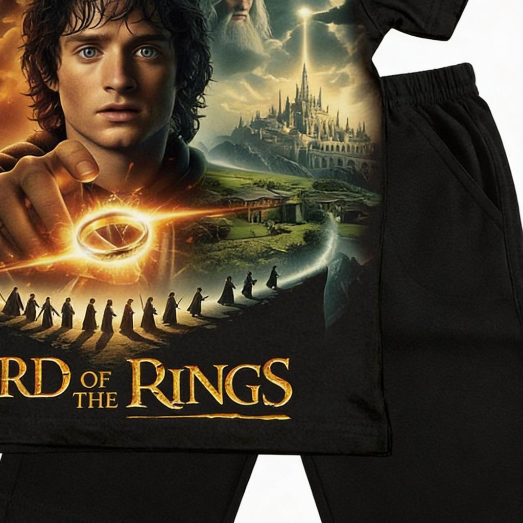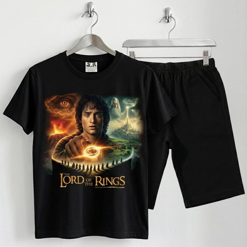 Черната тениска с впечатляващ, детайлен принт носи цялата магия на историята – огън, светлина, битка и съдба. Комбинирана с удобни черни бермуди, визията става завършена, модерна и силна.