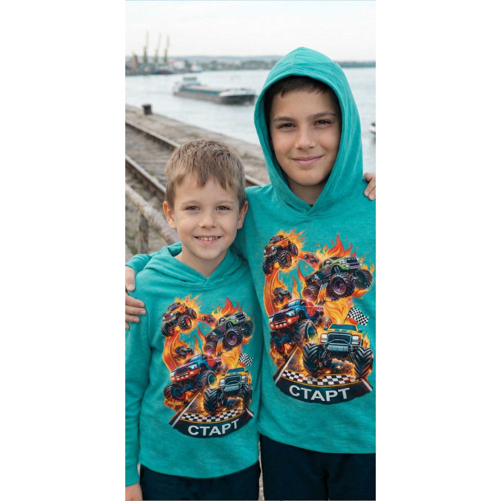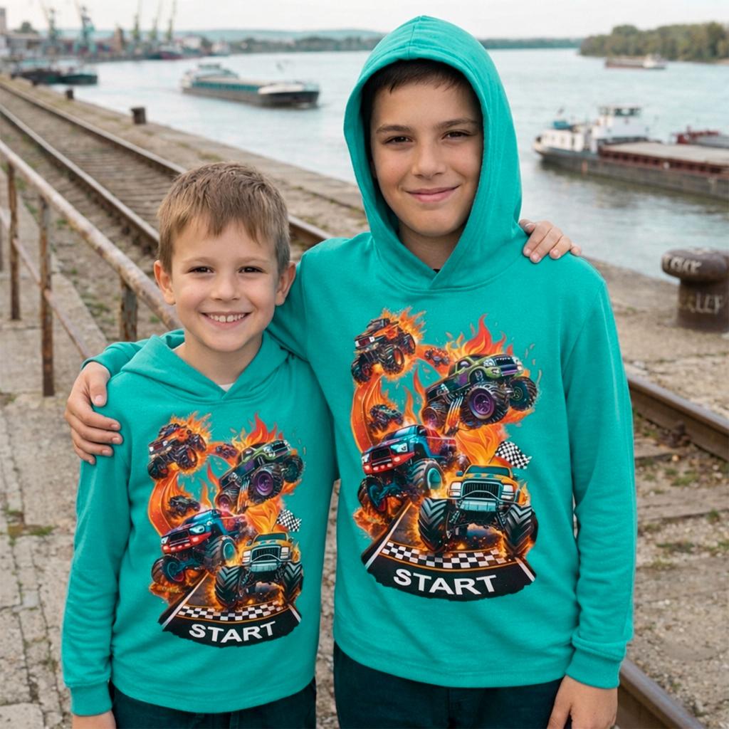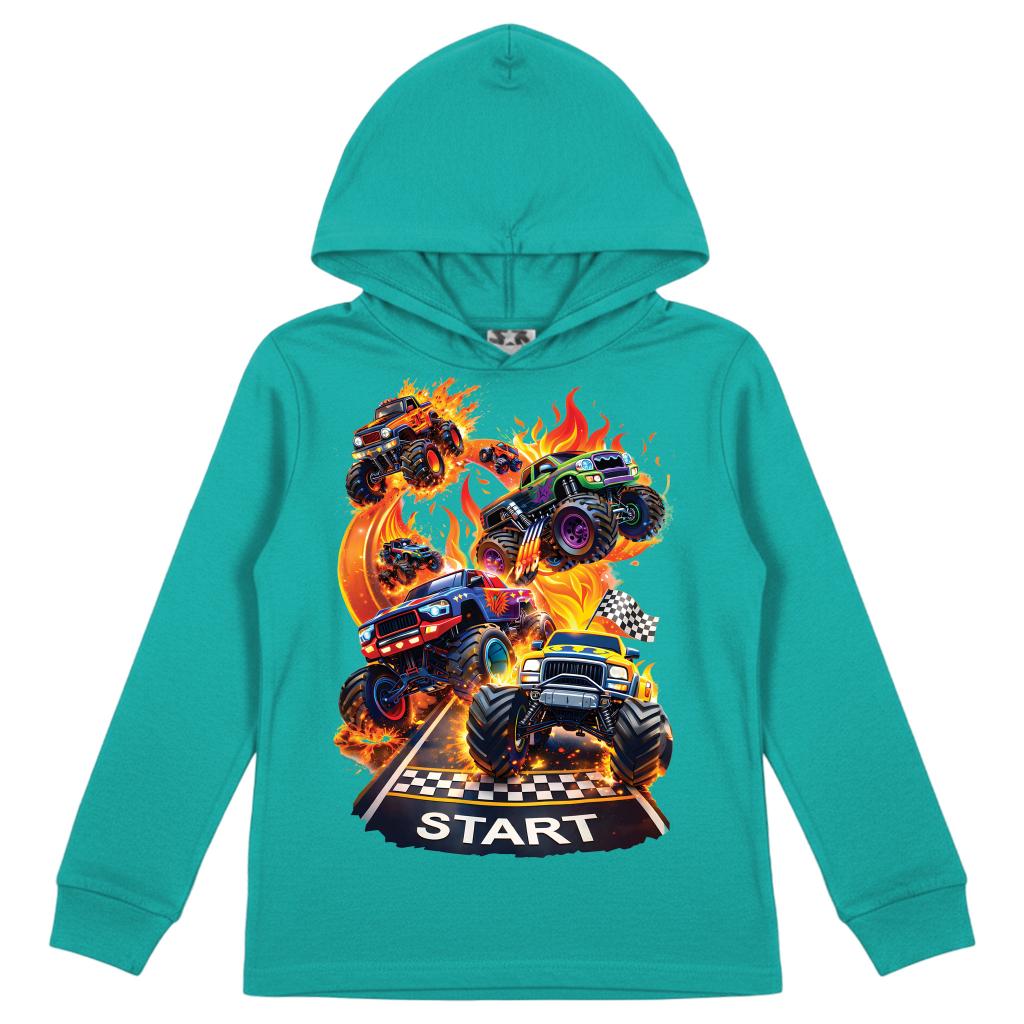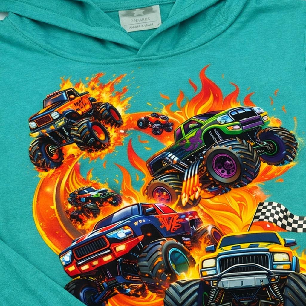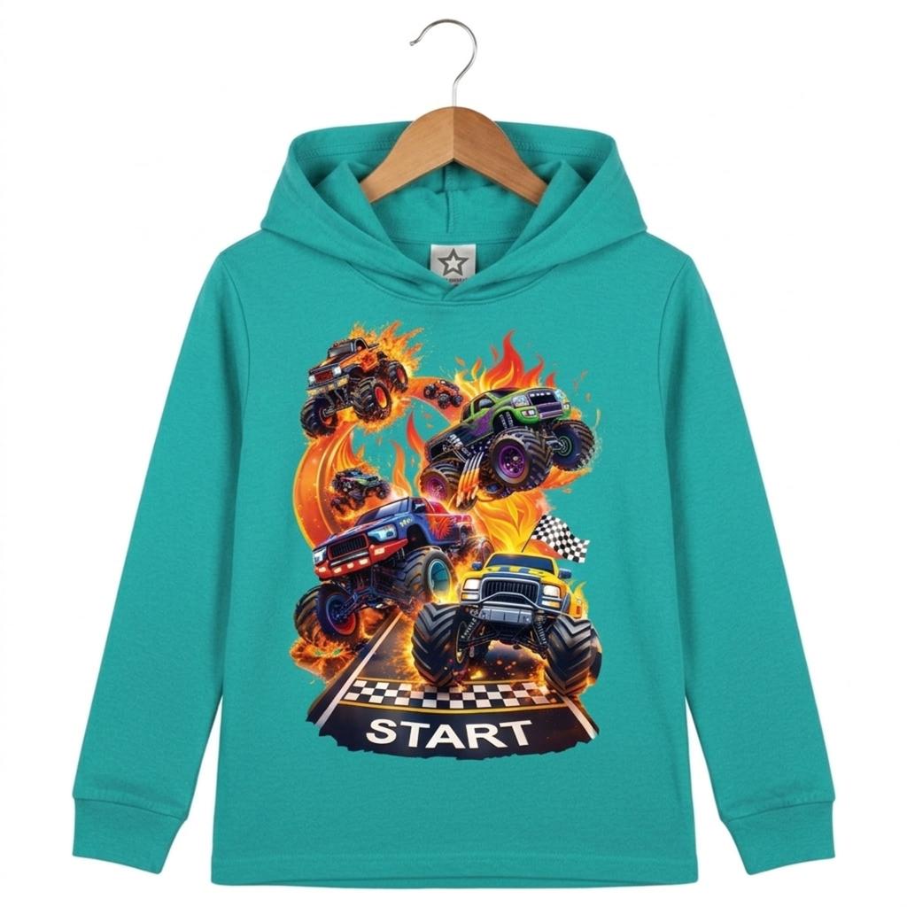 Тази тюркоазена тънка блуза с качулка е създадена за момчета, които обичат скоростта, екшъна и големите машини. Динамичният принт с monster truck автомобили, огнени ефекти и стартова линия превръща модела в истински фаворит.