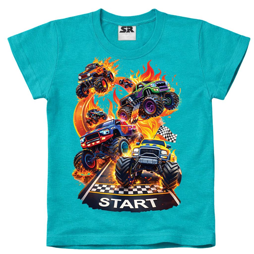 🚗💥 „Monster Race START“ – тюркоазена детска тениска за малките шампиони на скоростта!