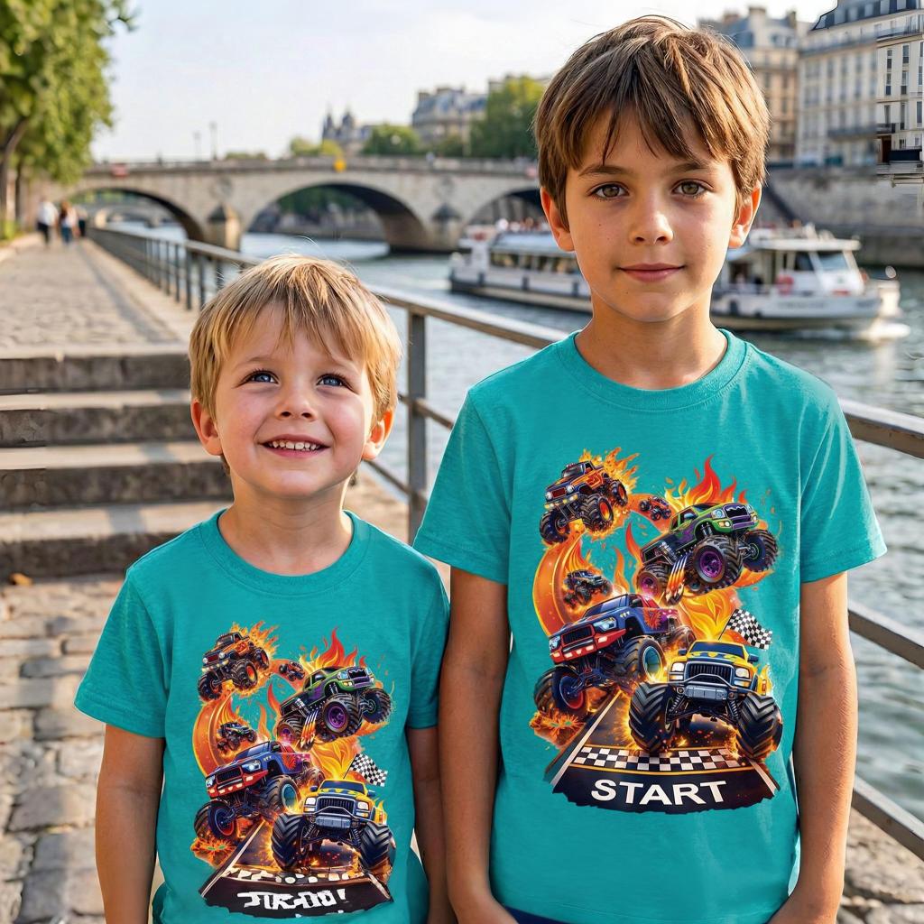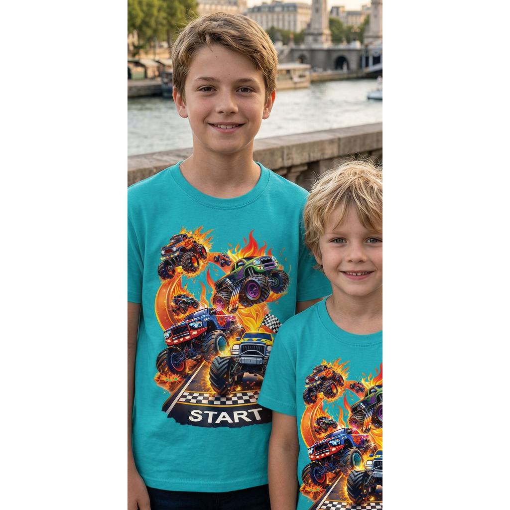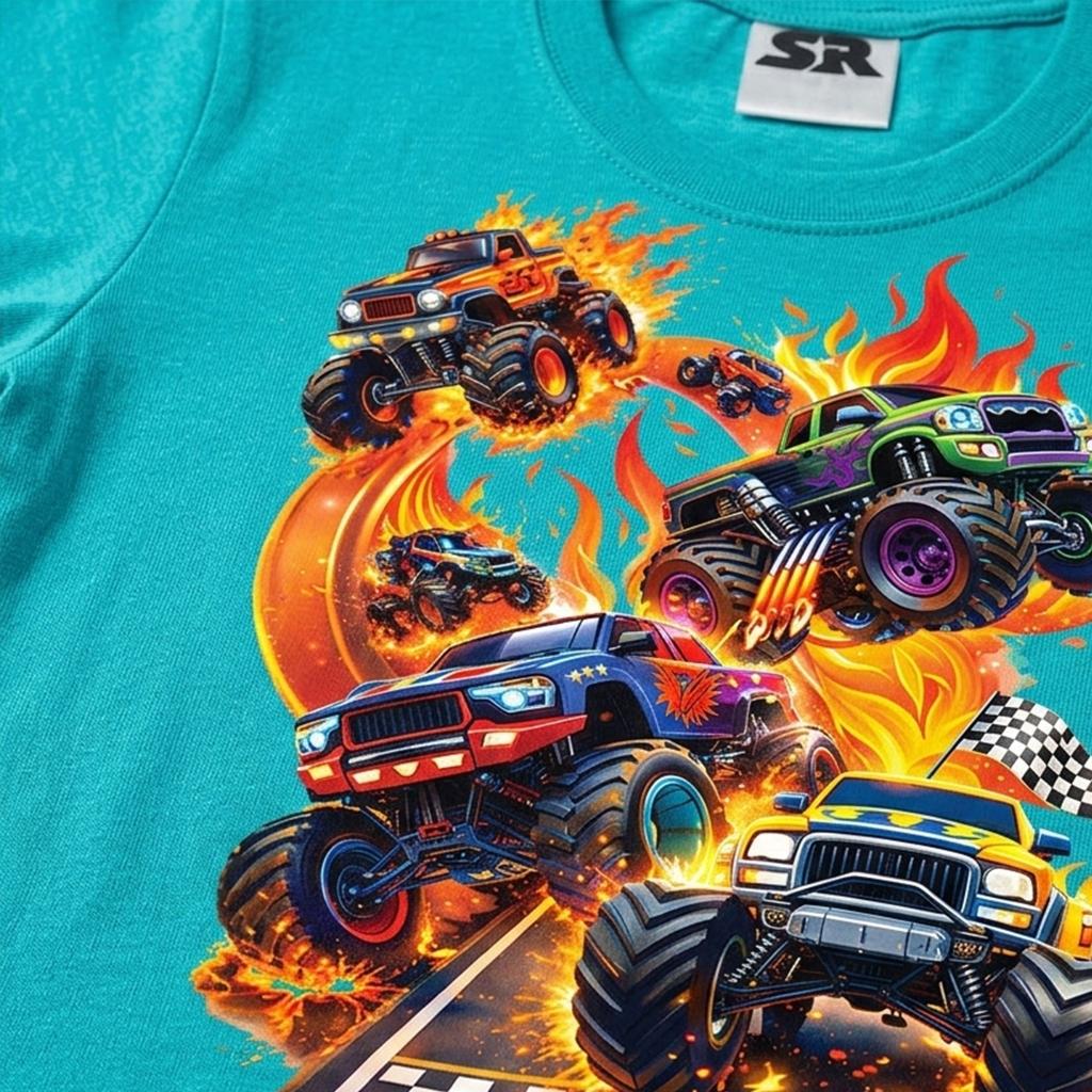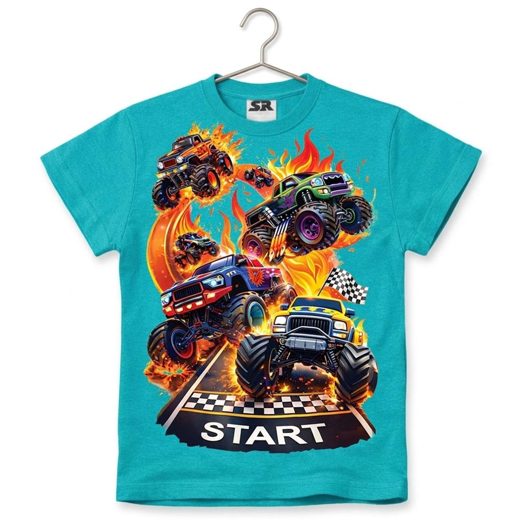 Тази впечатляваща тюркоазена тениска пренася децата направо на състезателната писта! Огромните чудовищни камиони, огнените ефекти и флагът за старт създават усещане за истинско адреналиново състезание. Дреха, която веднага привлича погледите и кара всяко дете да се чувства като победител. 🏁🔥