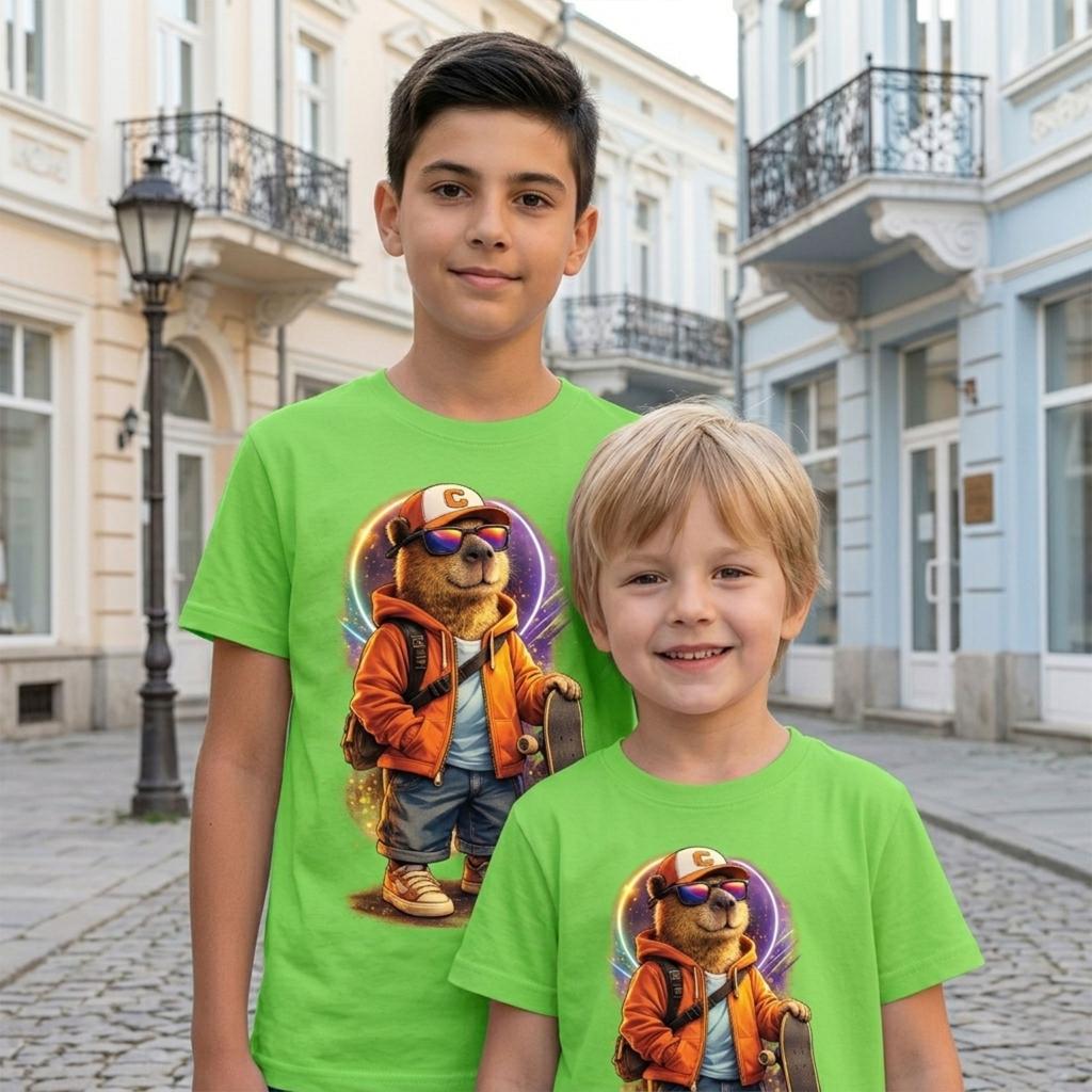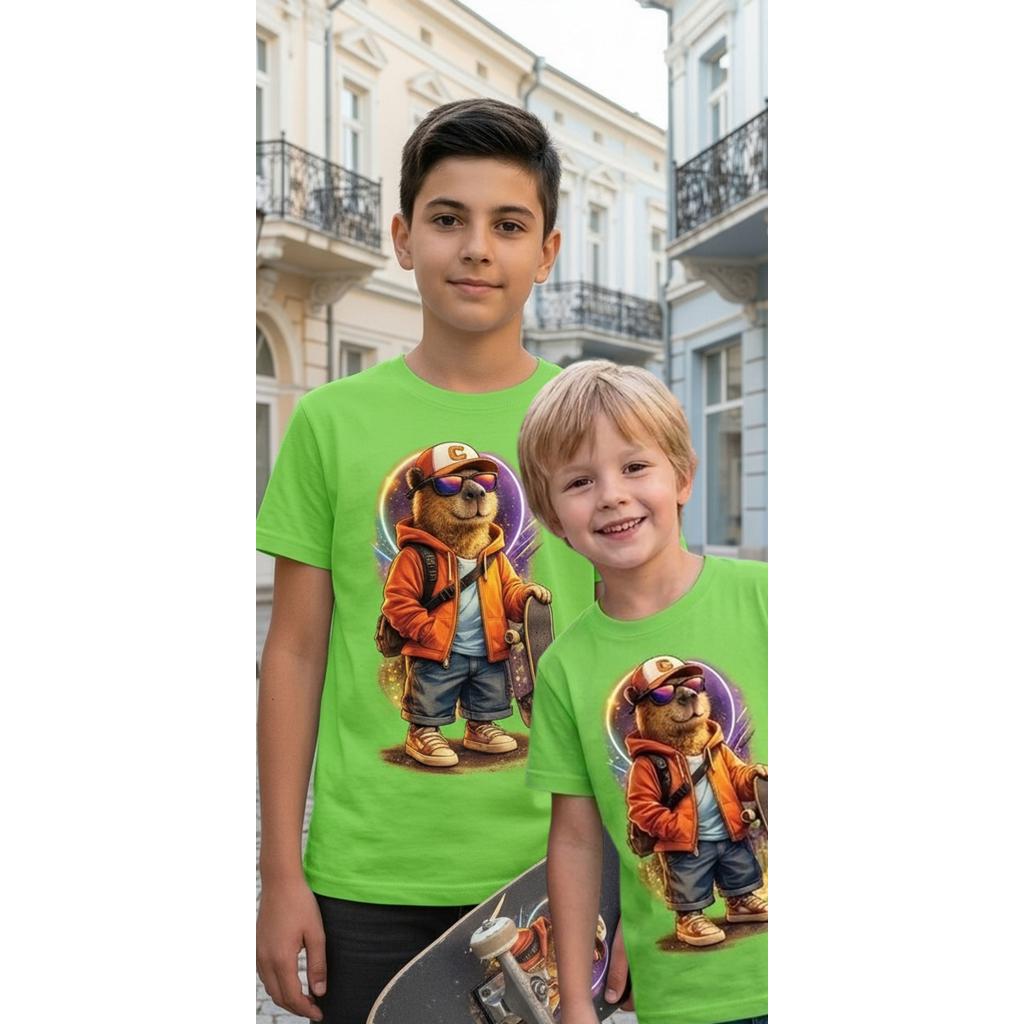 Ако детето обича весели герои и модерна визия, тази тениска е истински хит! Свежият зелен цвят се съчетава перфектно с готиния принт на Skate Капибара – най-спокойният и стилен герой на скейт сцената. С модерна визия и настроение за приключения, тази тениска бързо се превръща в любима част от детския гардероб. 🧢✨