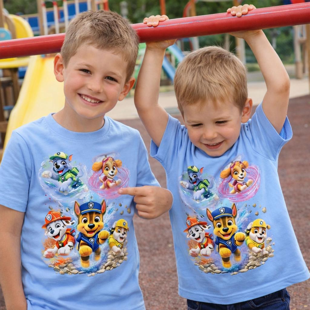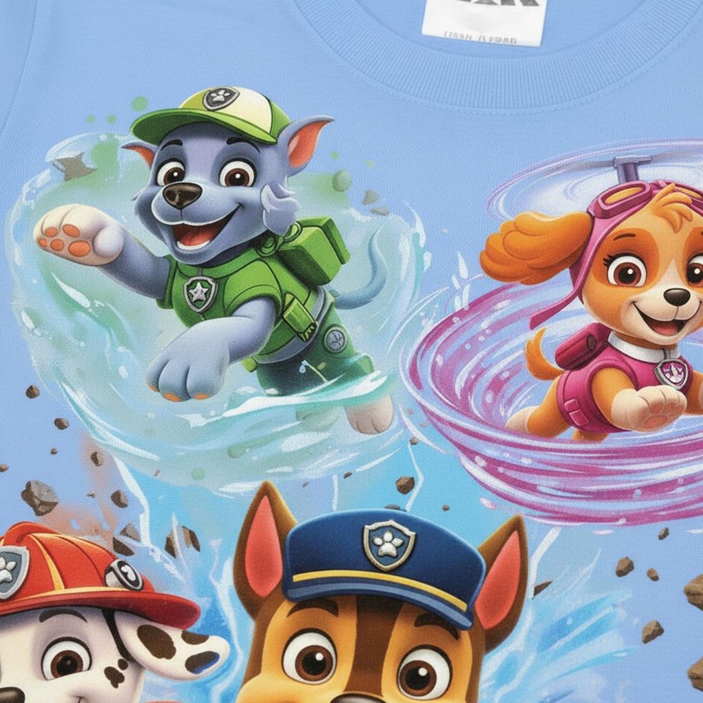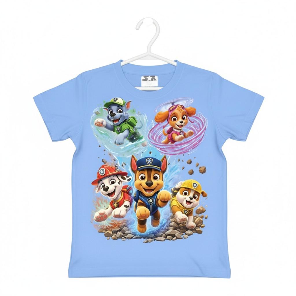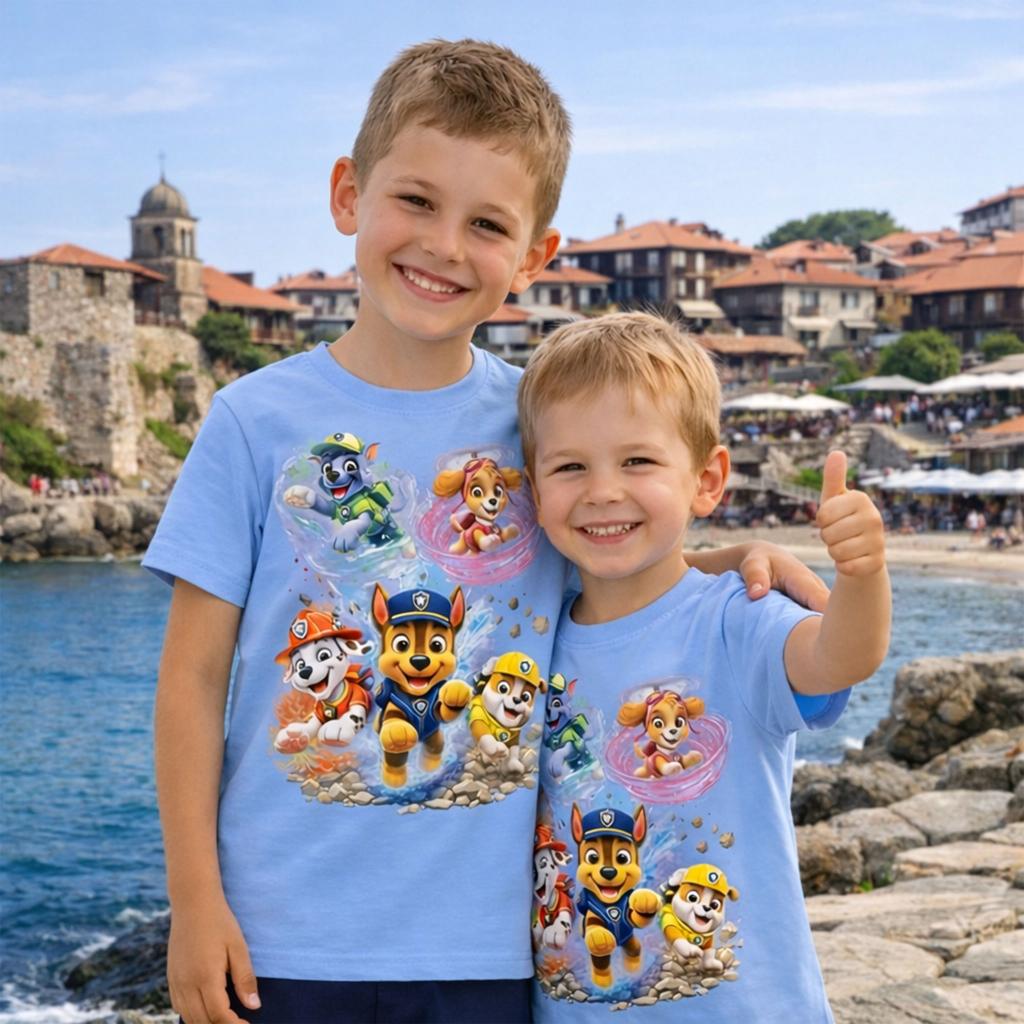Тази ярка синя детска тениска с веселите герои от Пес Патрул носи настроение, усмивки и много енергия. Създадена е за малките фенове на спасителния екип, които обичат игри, тичане и нови приключения всеки ден.