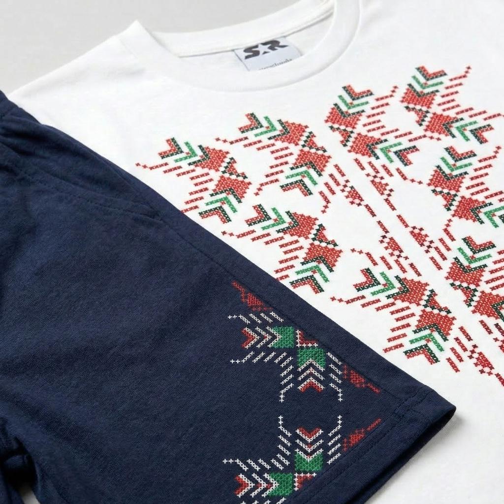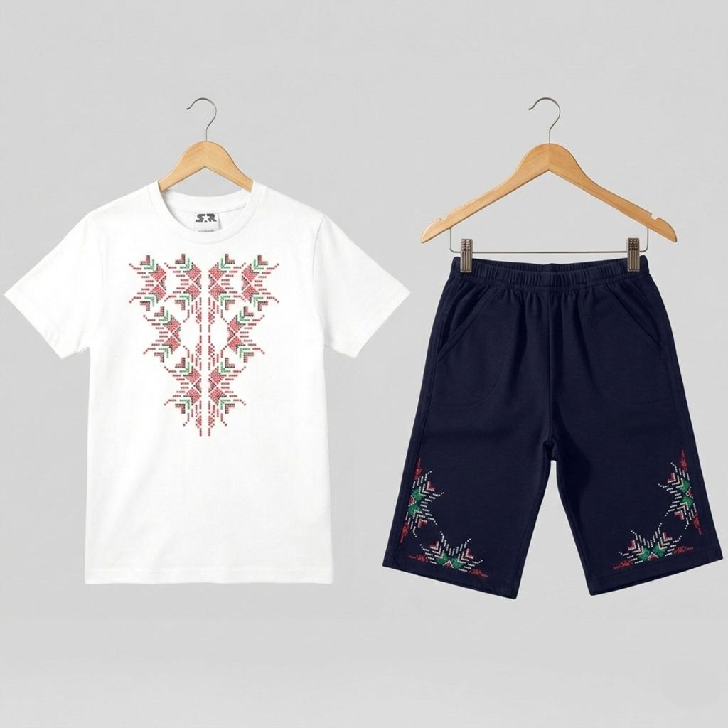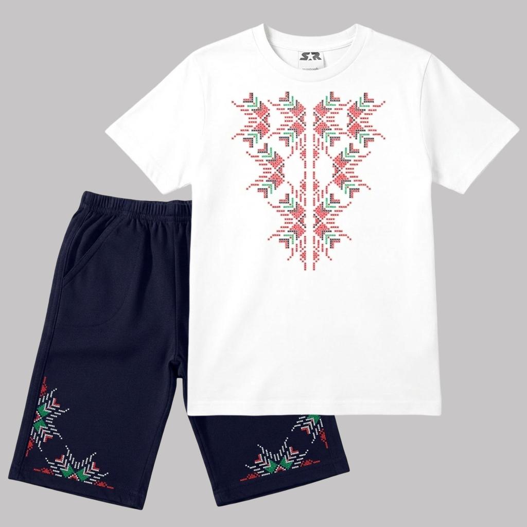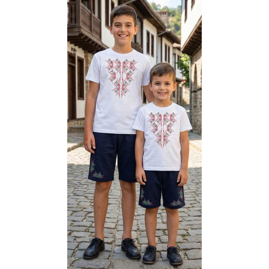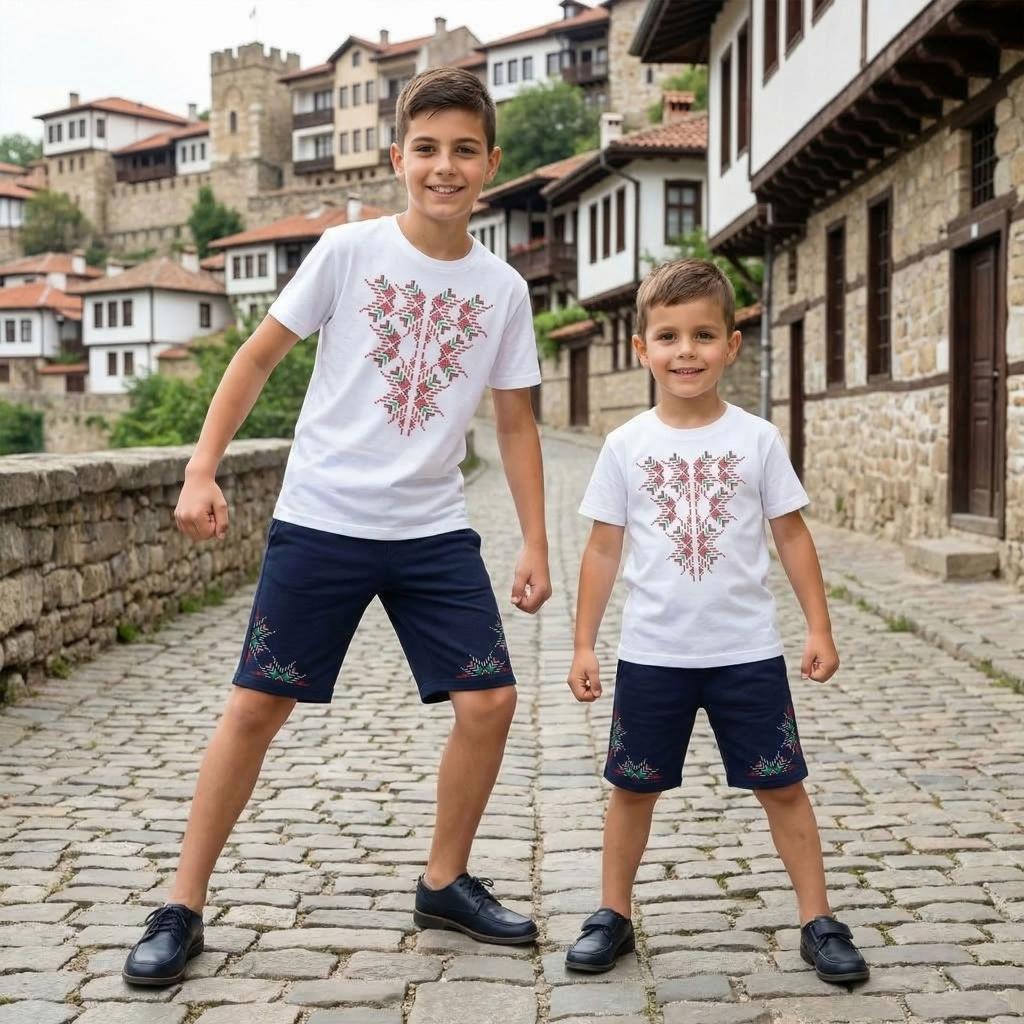 Красив и стилен детски комплект, който съчетава модерна визия и българска традиция. Комплектът включва бяла тениска с ефектна шевица и тъмносини бермуди, украсени със същите традиционни мотиви, създавайки хармонична и впечатляваща визия.