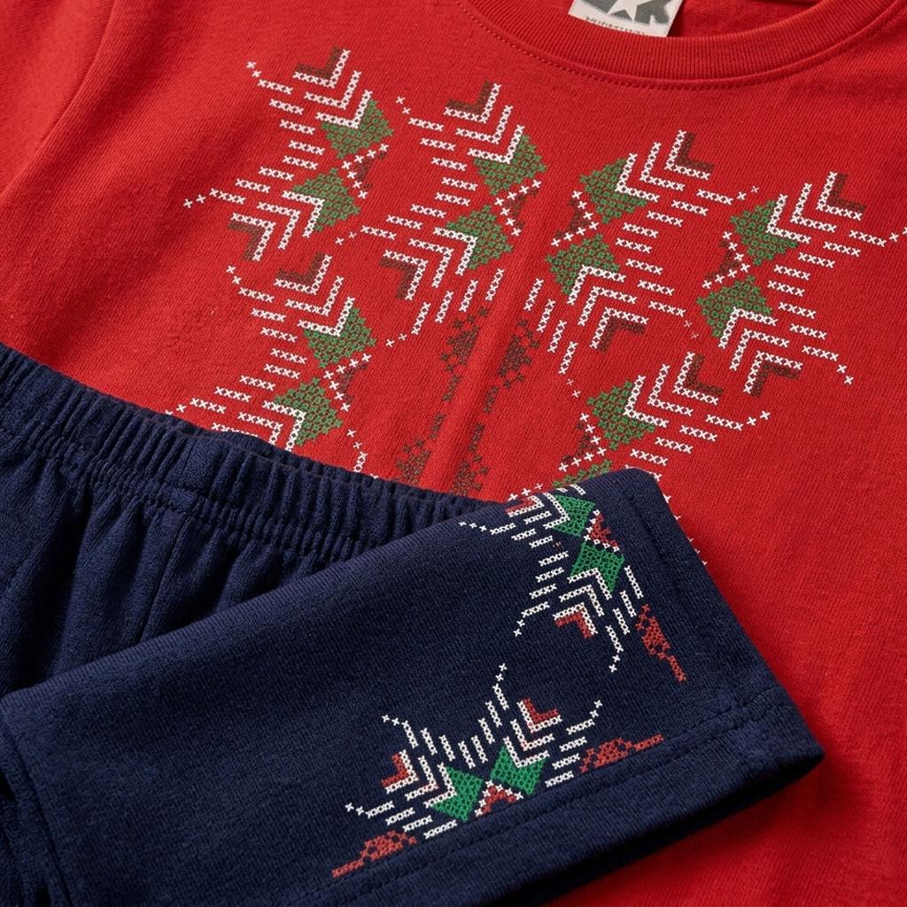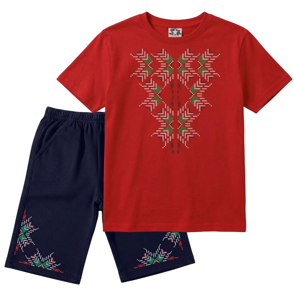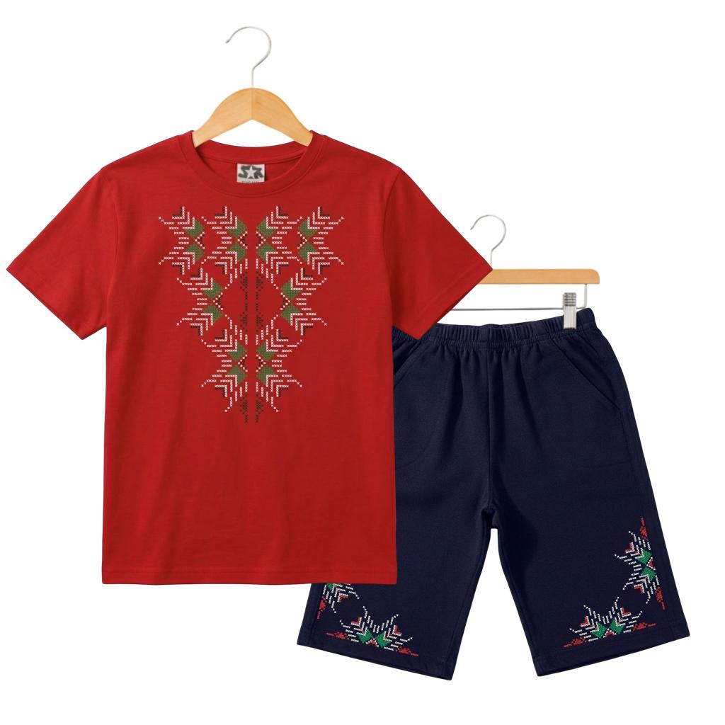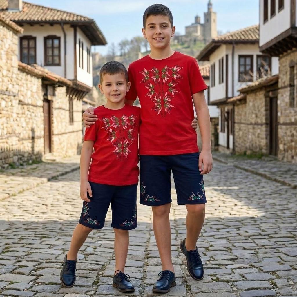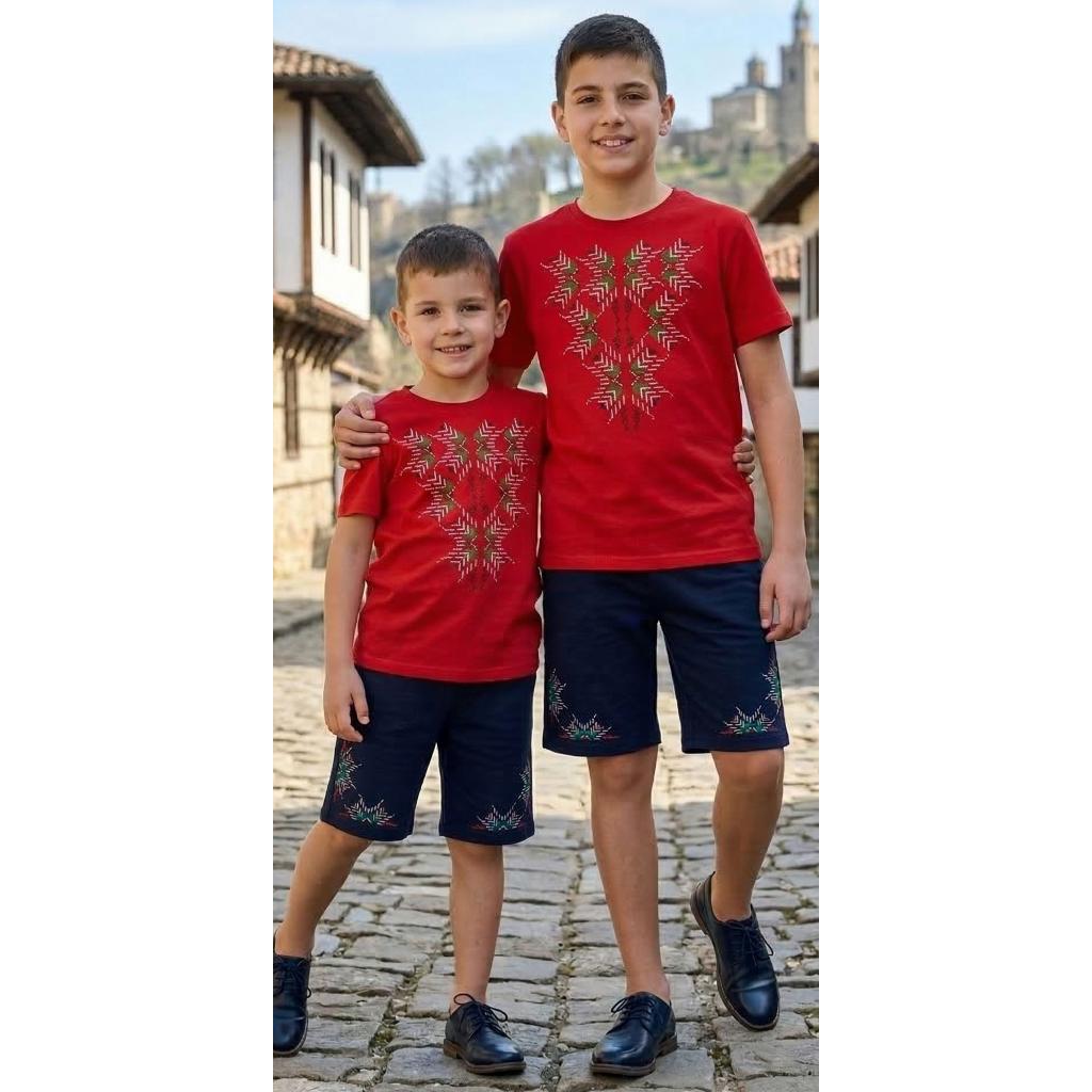 Красив и стилен детски комплект, който съчетава модерна визия и българска традиция. Комплектът включва червена тениска с ефектна шевица и тъмносини бермуди, украсени със същите традиционни мотиви, създавайки хармонична и впечатляваща визия.