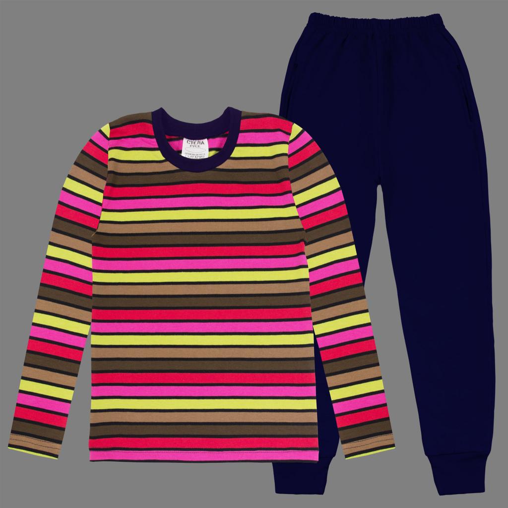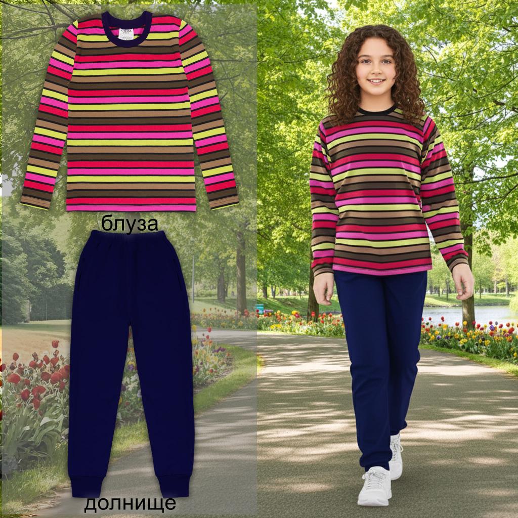 Горнище (Блуза): Дълъг ръкав с ярки хоризонтални райета в комбинация от шоколадово кафяво, неоново розово, жълто и наситено червено. Облото деколте е в тъмносиньо, което придава завършен вид. Блузата е създадена да носи настроение!