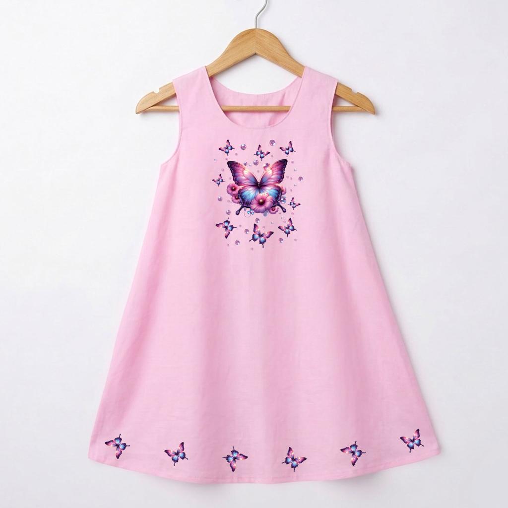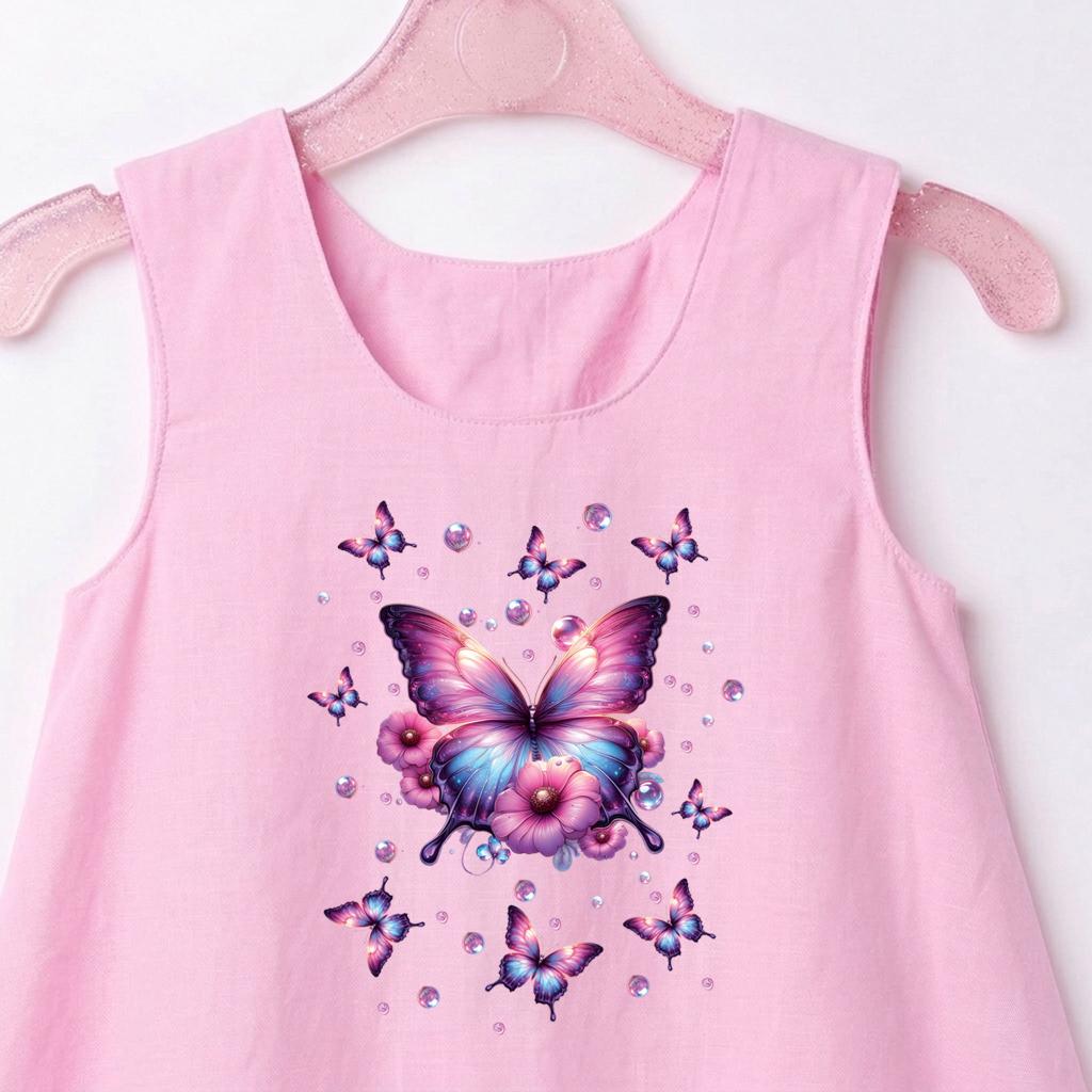 Отпред роклята е украсена с красива и цветна илюстрация с DTF печат, която привлича вниманието и носи настроение. В долната част по целия край има редуващи се малки картинки от същата тематика, които създават завършен и ефектен дизайн – истинска приказка в движение!