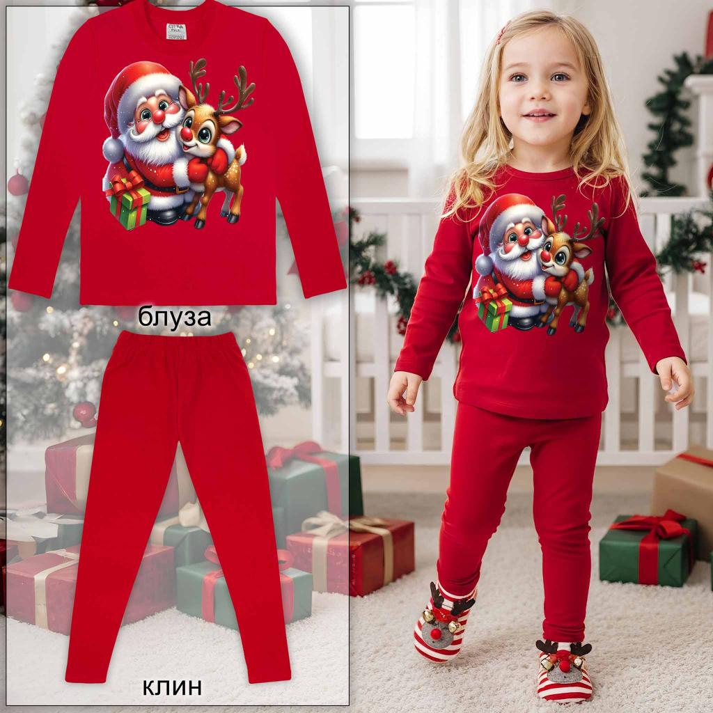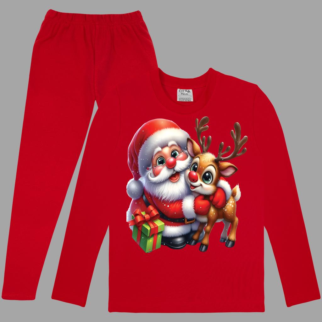 Горнище (Блуза): Дълъг ръкав в класическо бяло с принт, който стопля сърцето: Усмихнат Дядо Коледа, прегърнал своето сладко еленче, което също носи празничен пуловер. Принтът е весел, ярък и пълен с подаръци!