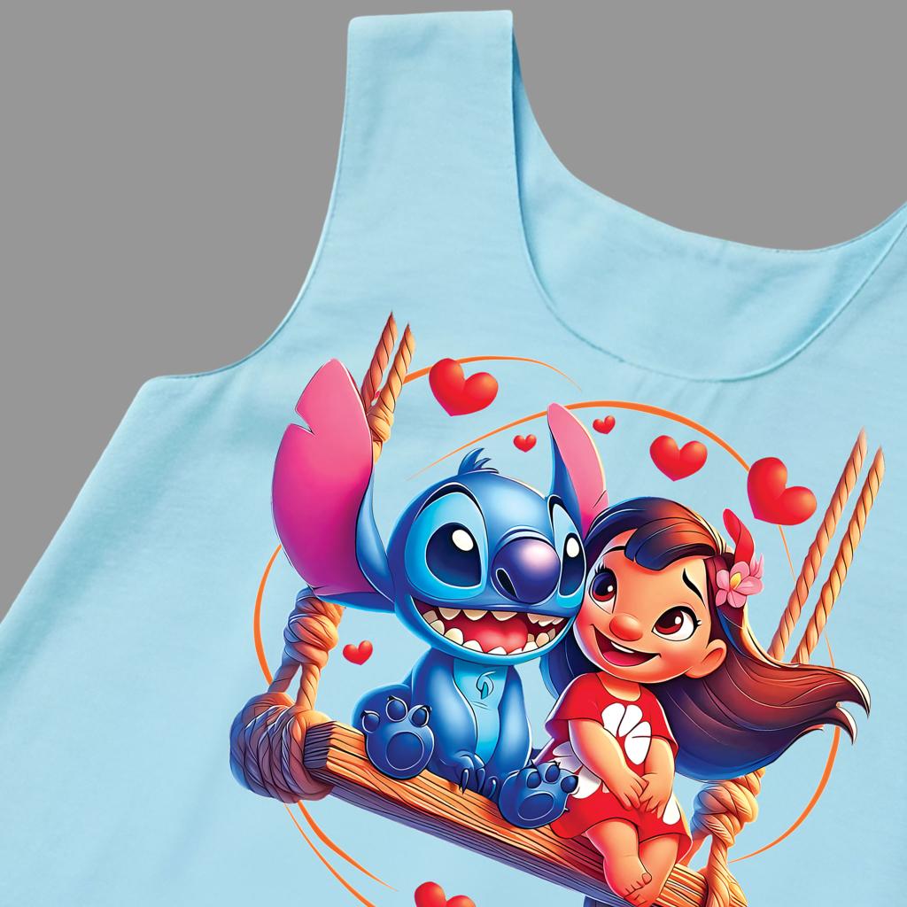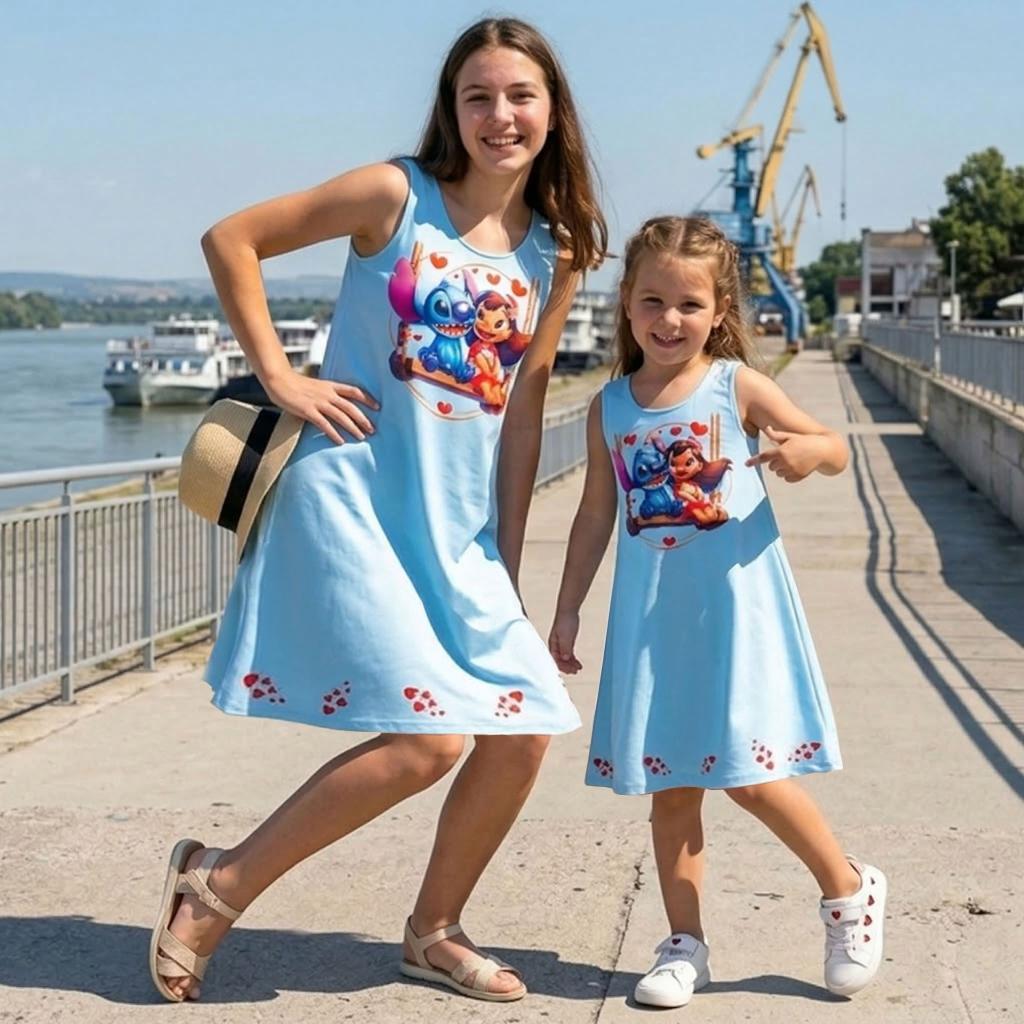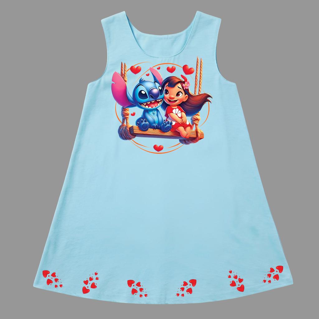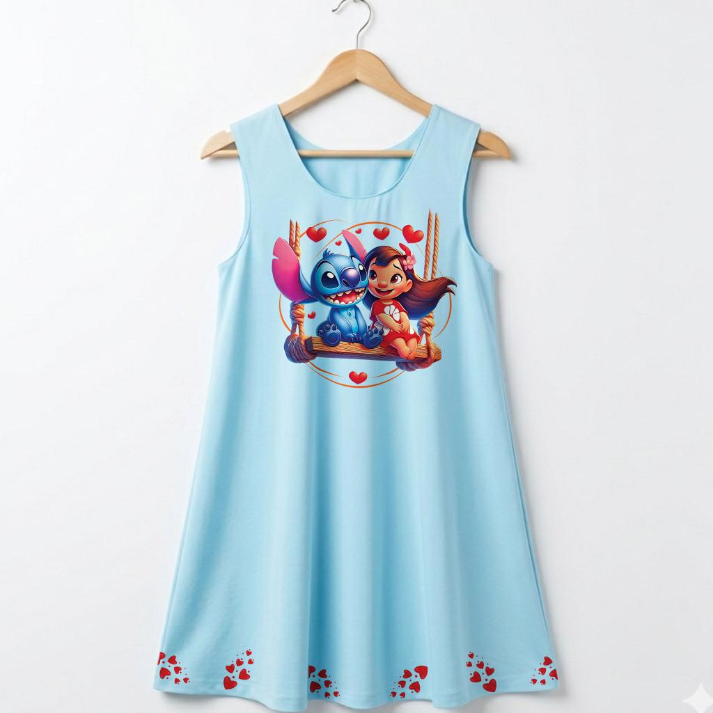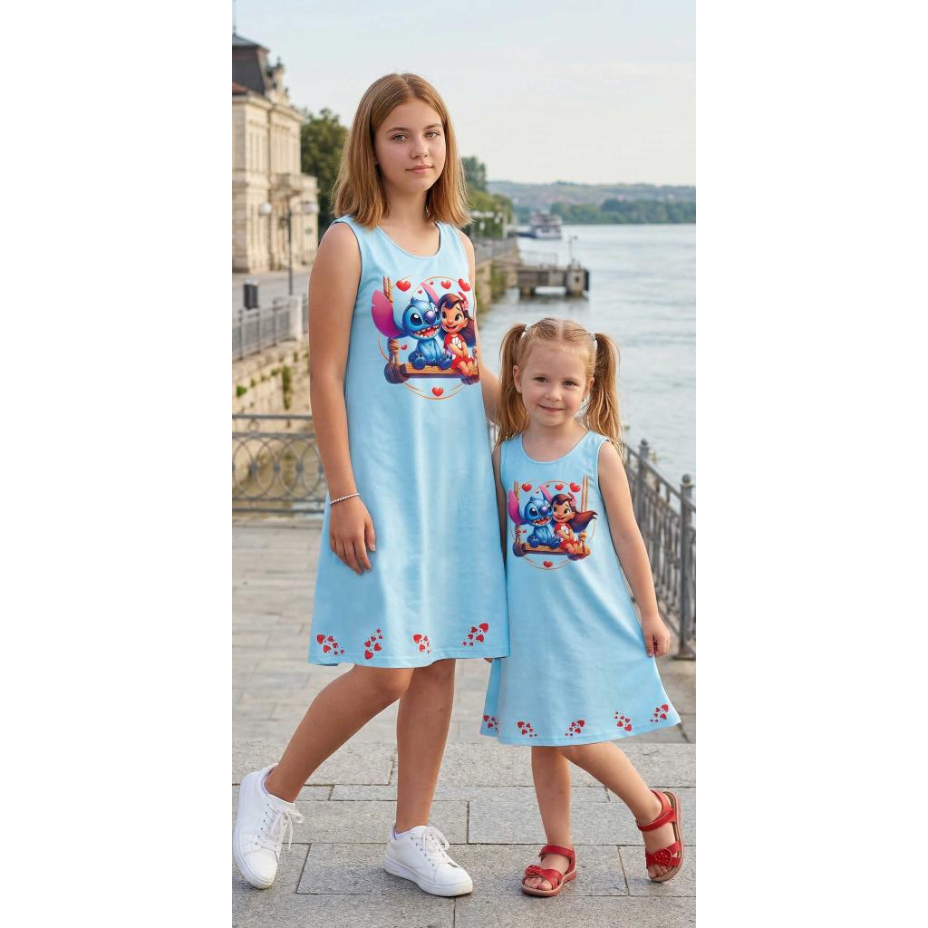 Отпред роклята е украсена с красива и цветна илюстрация с DTF печат, която привлича вниманието и носи настроение. В долната част по целия край има редуващи се малки картинки от същата тематика, които създават завършен и ефектен дизайн – истинска приказка в движение!