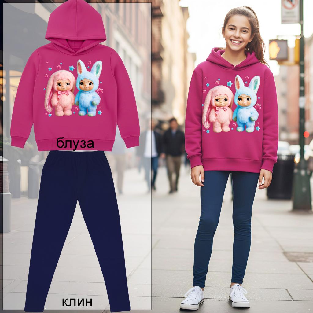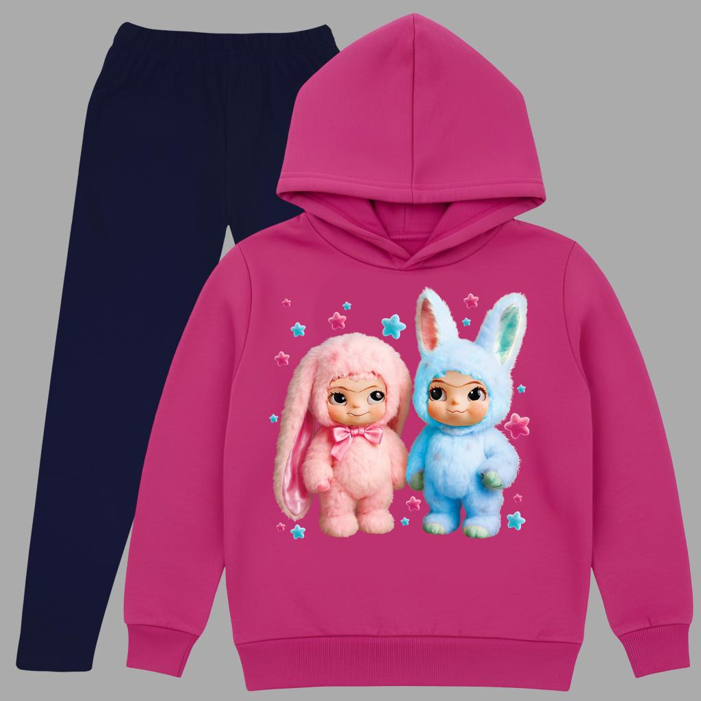 🐰 Комплект „Пухкави приятели“ – розова блуза с качулка + тъмен плътен клин