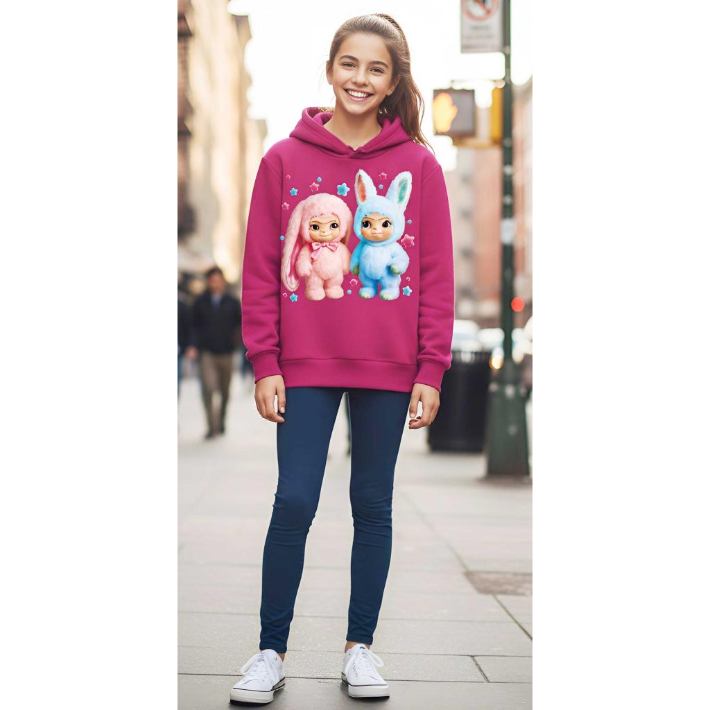 Впечатляващ принт с любимите пухкави герои – розово и синьо зайче