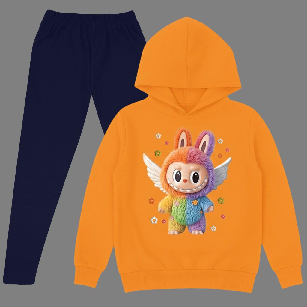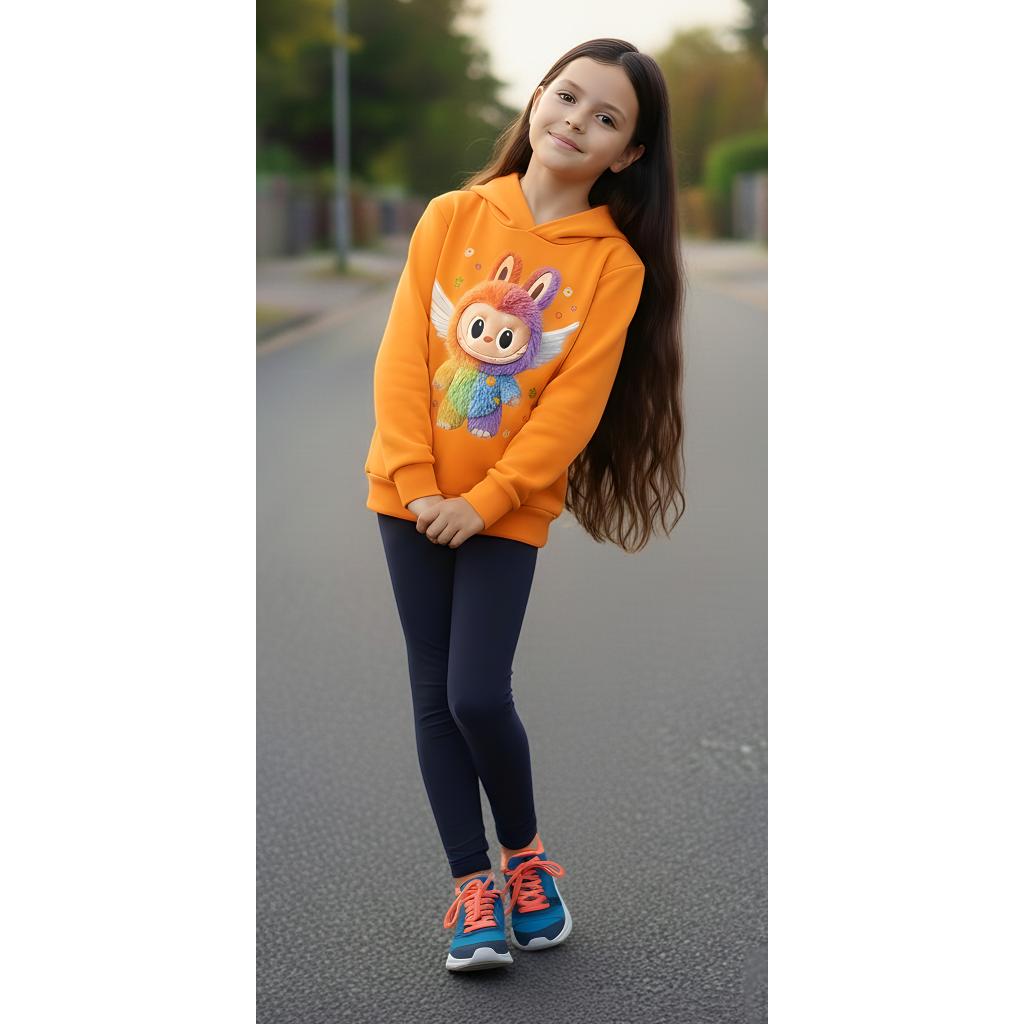 Представяме ти невероятен комплект за момичета – розов суичър с качулка и шарения пухкав Лабубу 🐰🪽, комбиниран с тъмен дълъг клин. 🎀