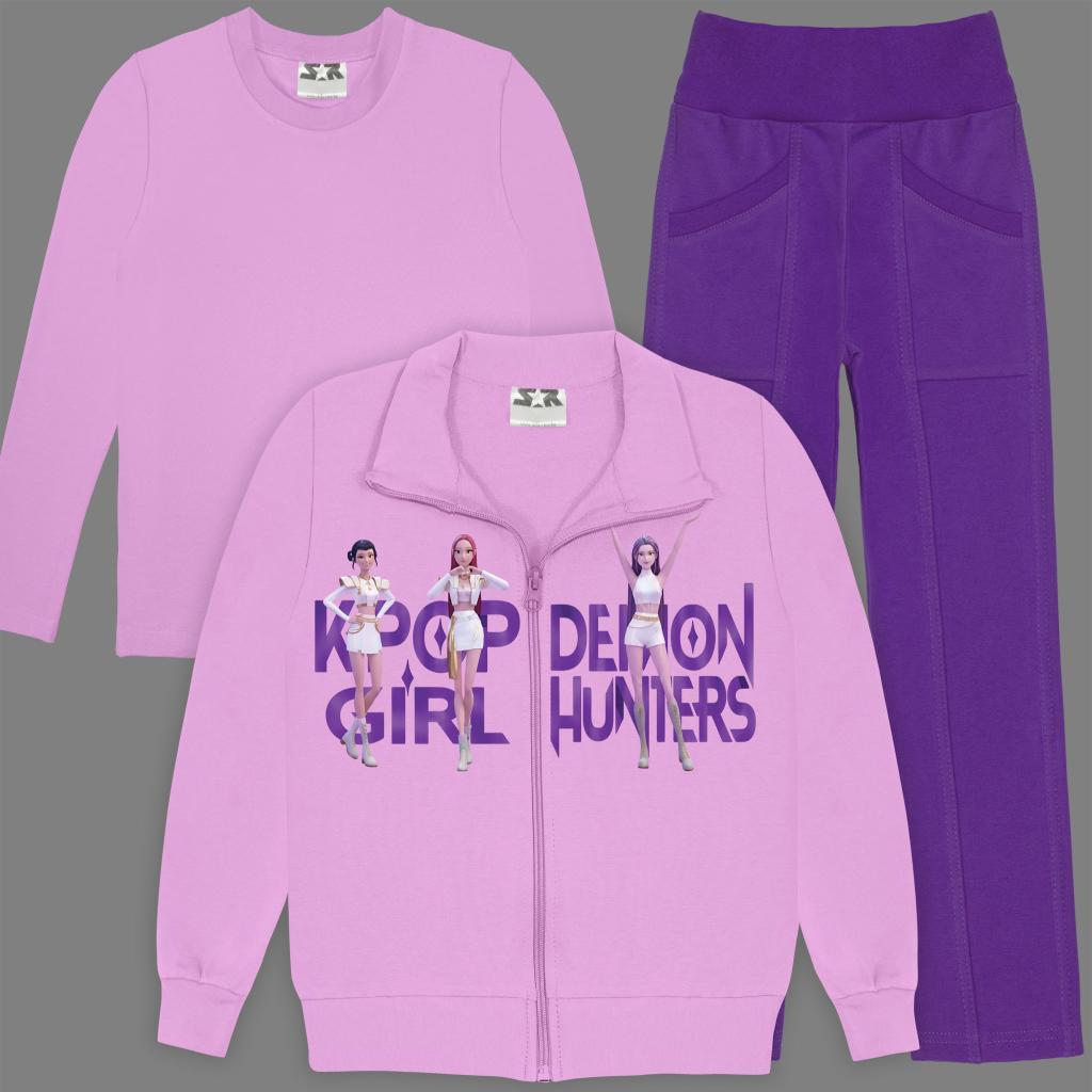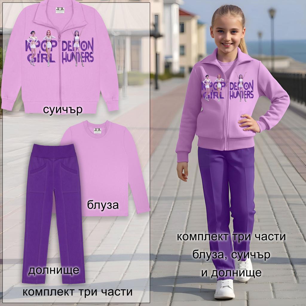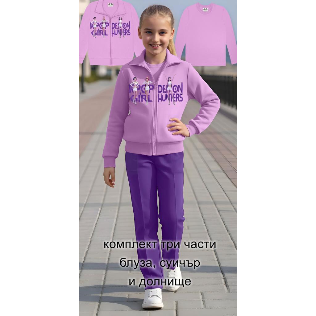 Модерен, цветен и супер удобен – сетът е вдъхновен от сцената на K-POP! 💜✨ Люляковата блуза е универсална и мека, суичърът с цип впечатлява с ефектен принт на K-POP героини, а лилавото долнище добавя комфорт и свобода на движението. Идеален за училище, игри или разходки! 🎶🙌