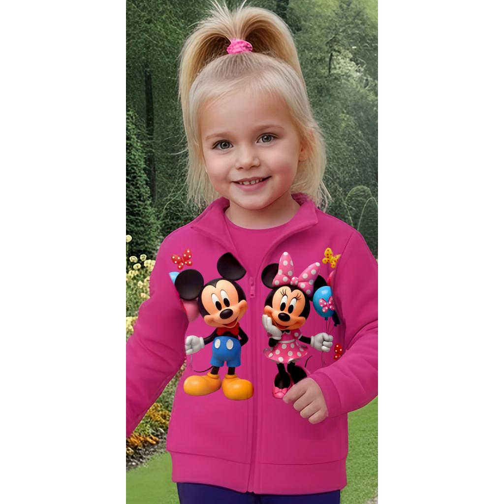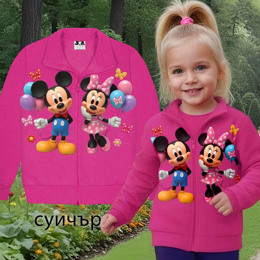 Нашият детски суичър в циклама с любимите герои Мини и Мики носи настроение, топлина и щипка магия във всеки ден! Ярките цветове и веселото изображение грабват вниманието, а меката материя гарантира комфорт дори и при най-щурите игри. 🎈