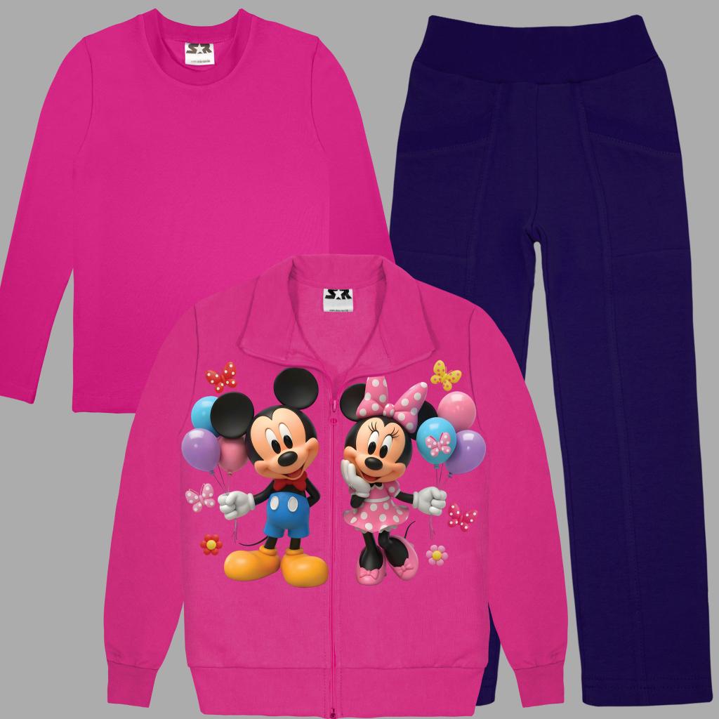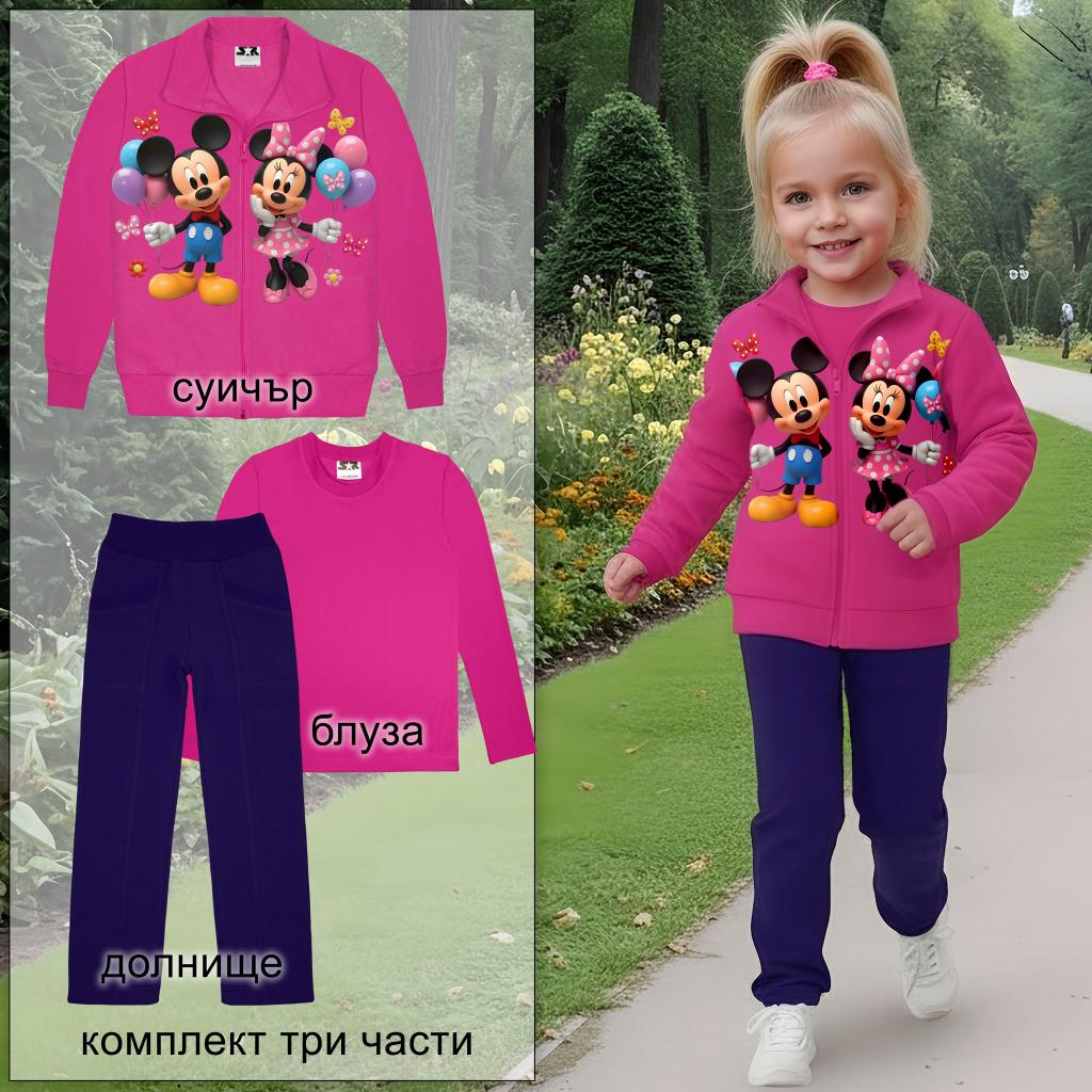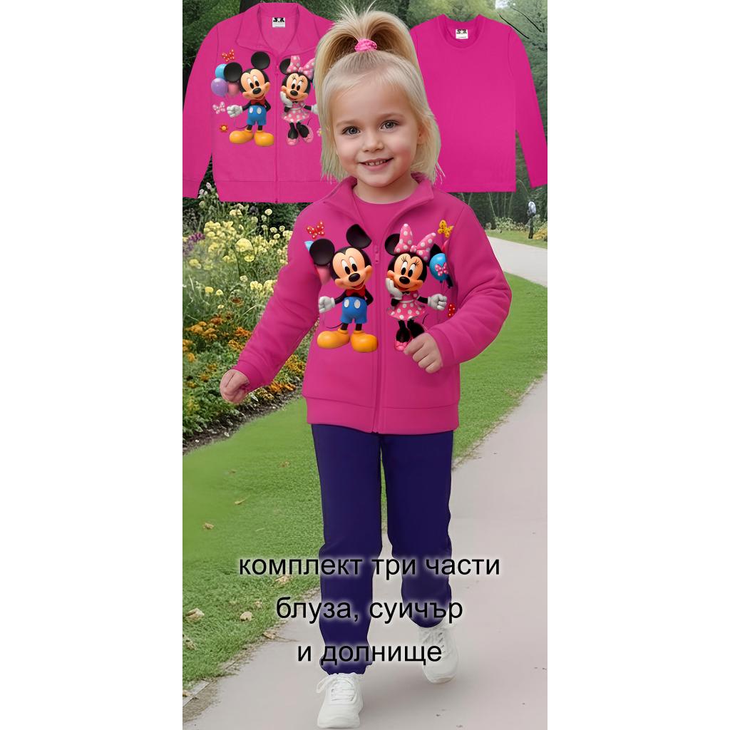 Този страхотен комплект е перфектният избор за всяка малка госпожица, която обича веселите герои и удобството! Състои се от суичър с Мини и Мики в циклама, едноцветна мека блуза и тъмно долнище, което чудесно допълва визията. Идеален за училище, разходка или игра в парка! 🎈