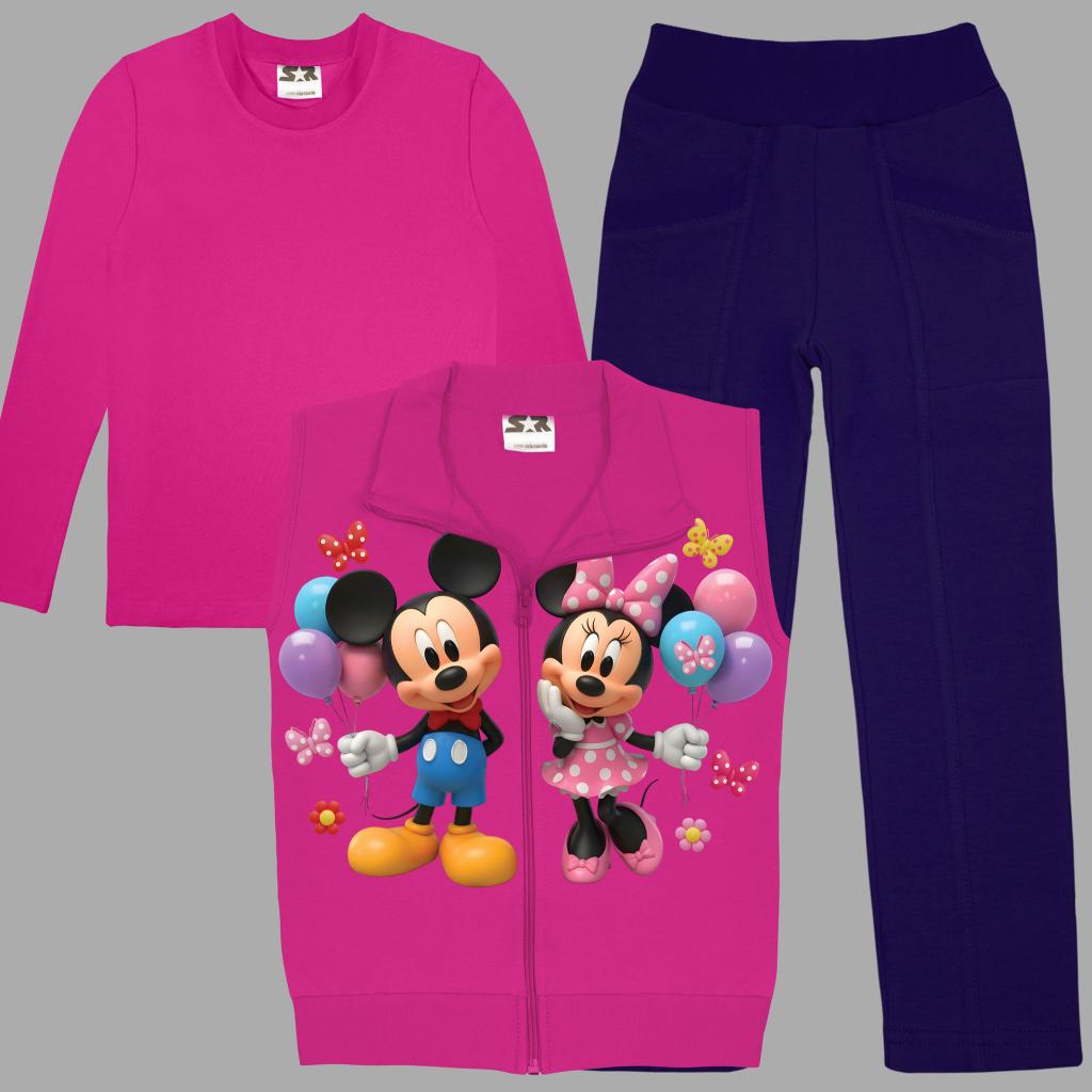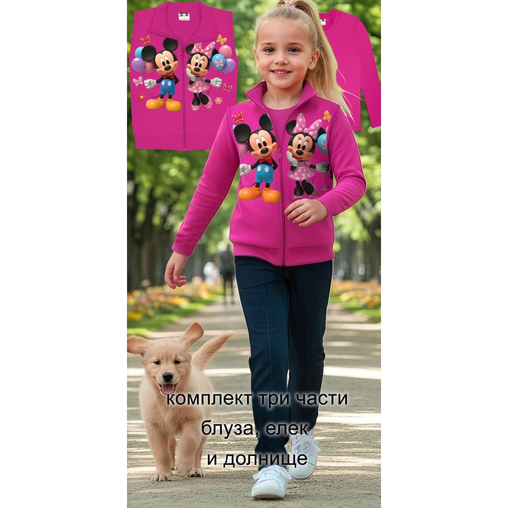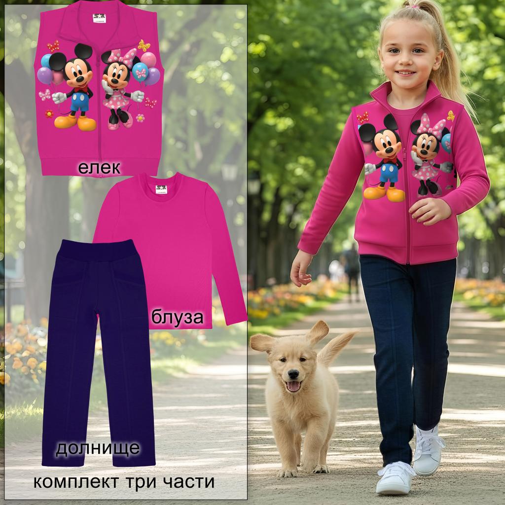 Елегантен и удобен комплект, съчетаващ елегантен елек с Мини и Мики в циклама, едноцветна мека блуза, и тъмно долнище, което завършва визията с изискан контраст. Подходящ за разходки, детска градина или училище – топъл, практичен и пълен с настроение! 🎈