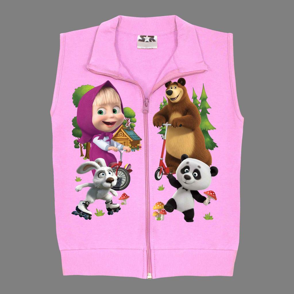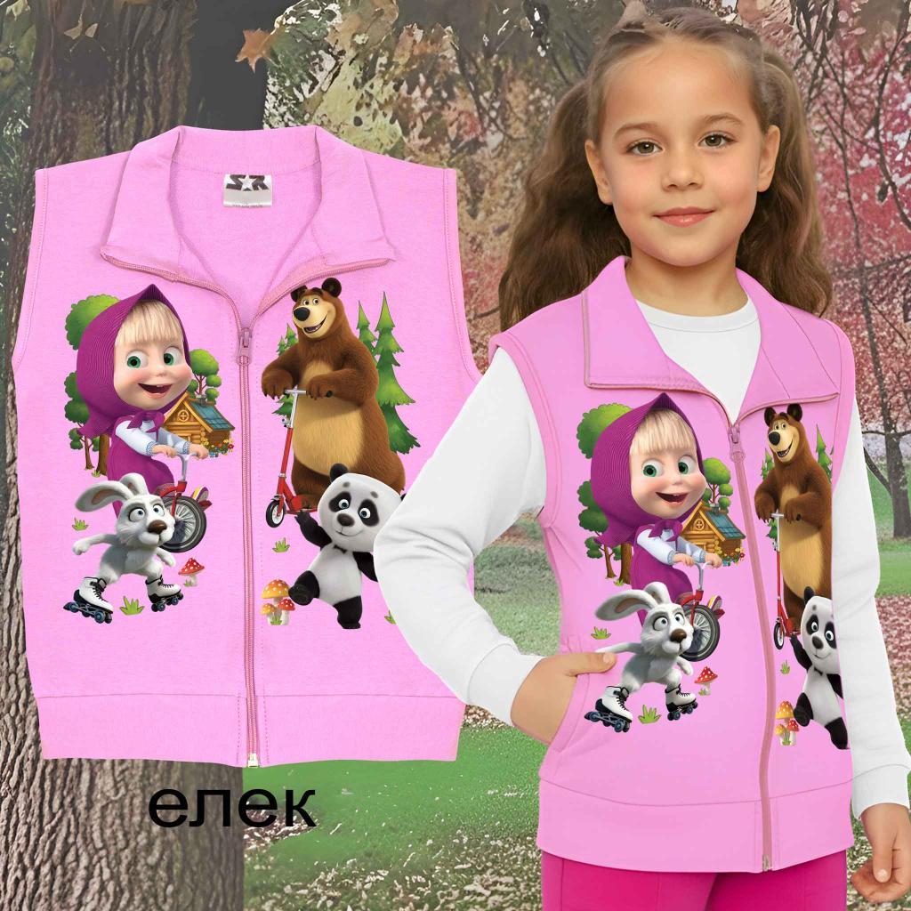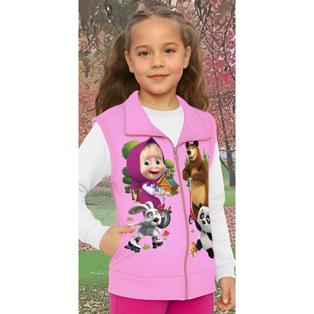 Очарователен детски елек в розово с любимата Маша и нейните приятели – перфектен за активните момичета, които обичат да тичат, играят и да са стилни едновременно! 💫