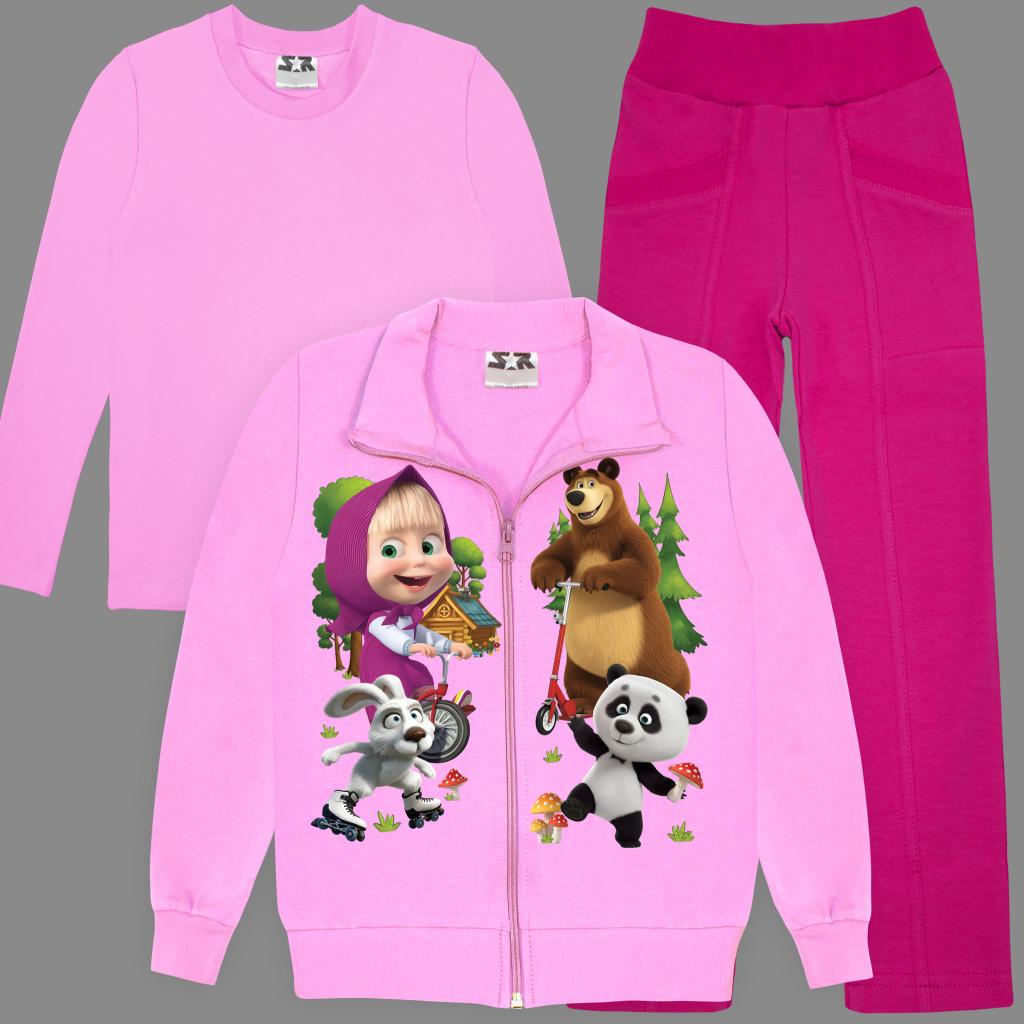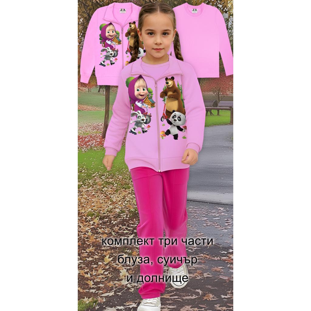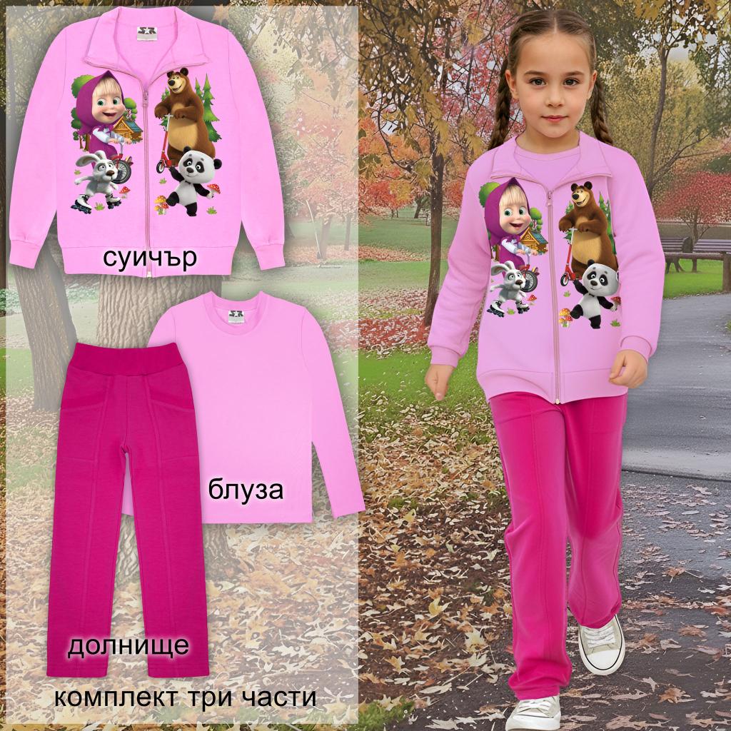 💗 Комплект “Маша в гората” – суичър, едноцветна блуза и долнище в циклама 🌸🐻