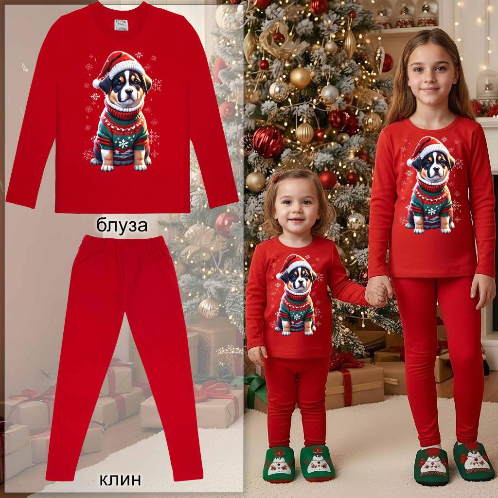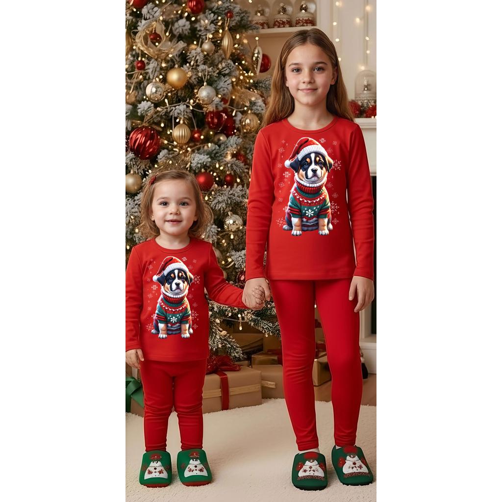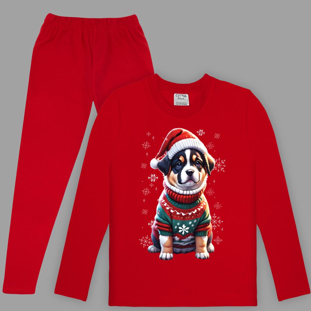 Герой: Горнището е в наситено червено и има голям, очарователен принт на кученце в коледна шапка и плетен коледен пуловер. Гарантирана усмивка!