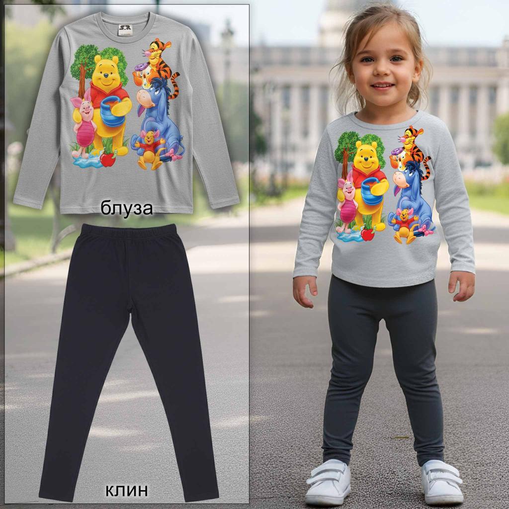 Този страхотен детски комплект съчетава удобство и приказна визия – свежа зелена блуза с дълъг ръкав и пъстър принт на Мечо Пух и неговите приятели, в комбинация с мек тъмен клин, който идеално допълва тоалета.