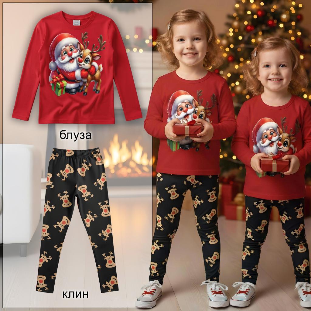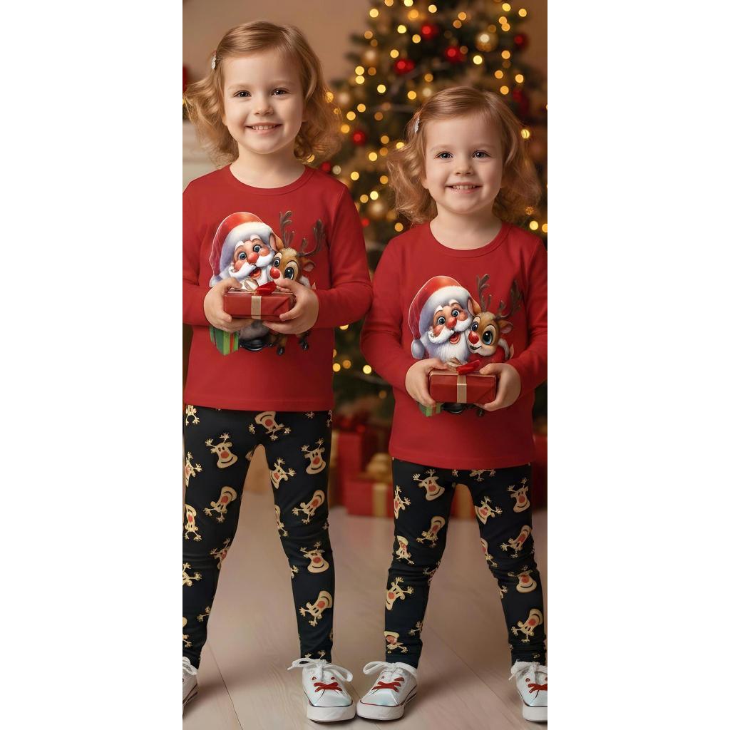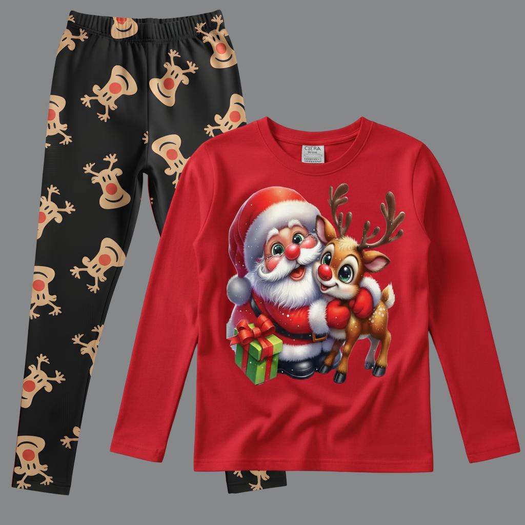 Горнище (Блуза): Дълъг ръкав в класическо червено с принт, който носи усмивки: Усмихнат Дядо Коледа, прегърнал своето сладко еленче (Рудолф), което носи шал. Принтът е допълнен от коледен подарък.