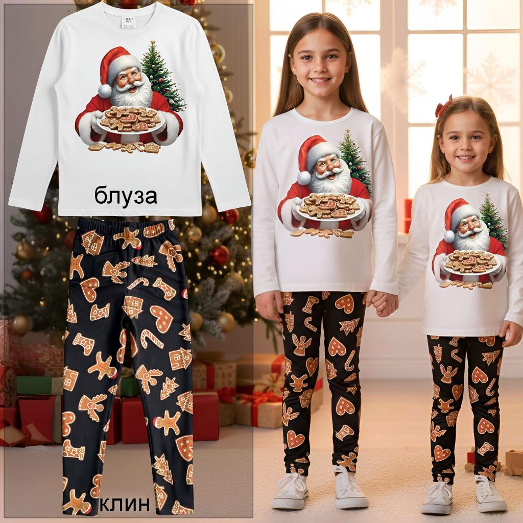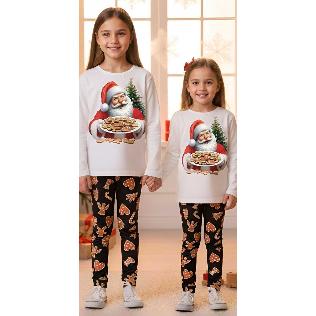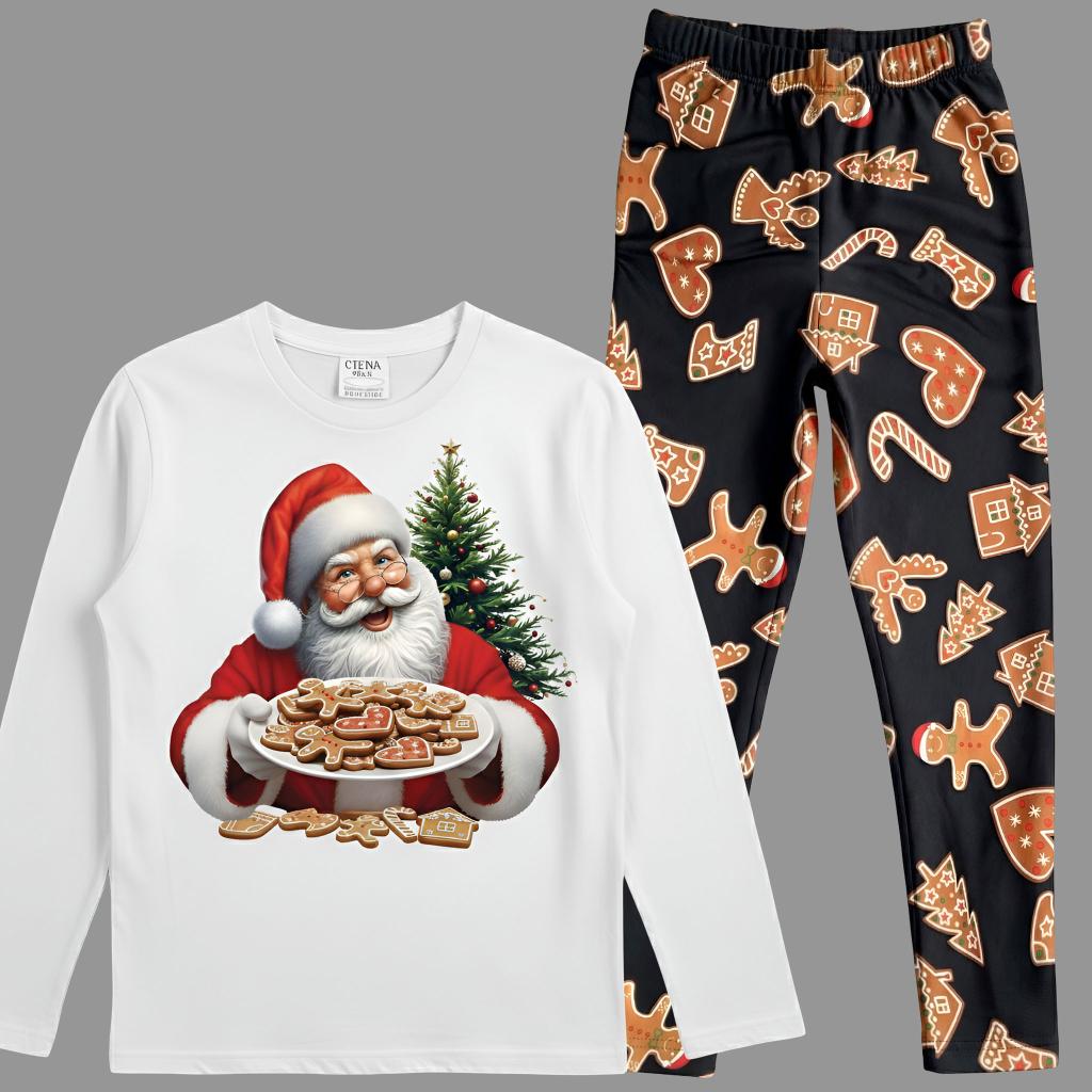 Горнище (Блуза): Дълъг ръкав в класическо бяло, което подчертава централния принт. В центъра е изобразен усмихнат Дядо Коледа с очила, облечен в червен костюм, сладко похапващ коледни сладки.