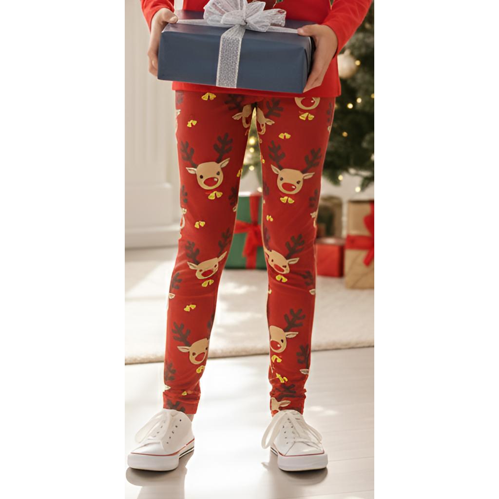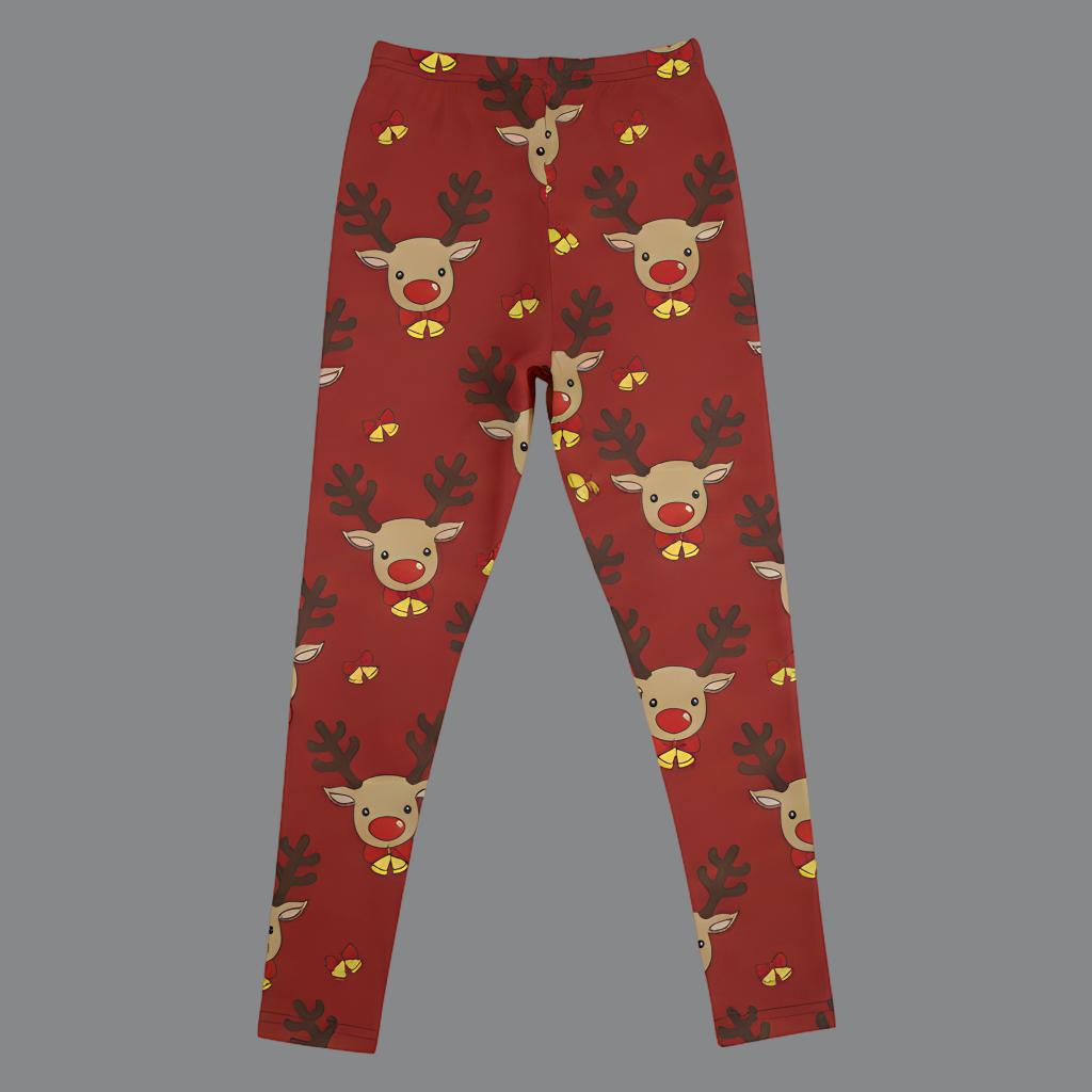 Цвят и Принт: Наситено празнично червено с повтарящ се принт на усмихнати еленчета с червен нос, заобиколени от камбанки.