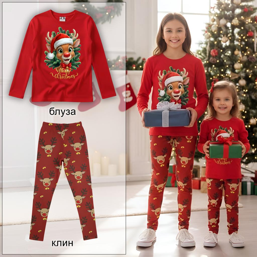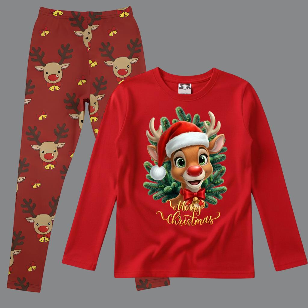 Горнище (Блуза): Дълъг ръкав в класическо червено с принт, който носи усмивки: Сладко усмихнато еленче (Рудолф), което носи шал.