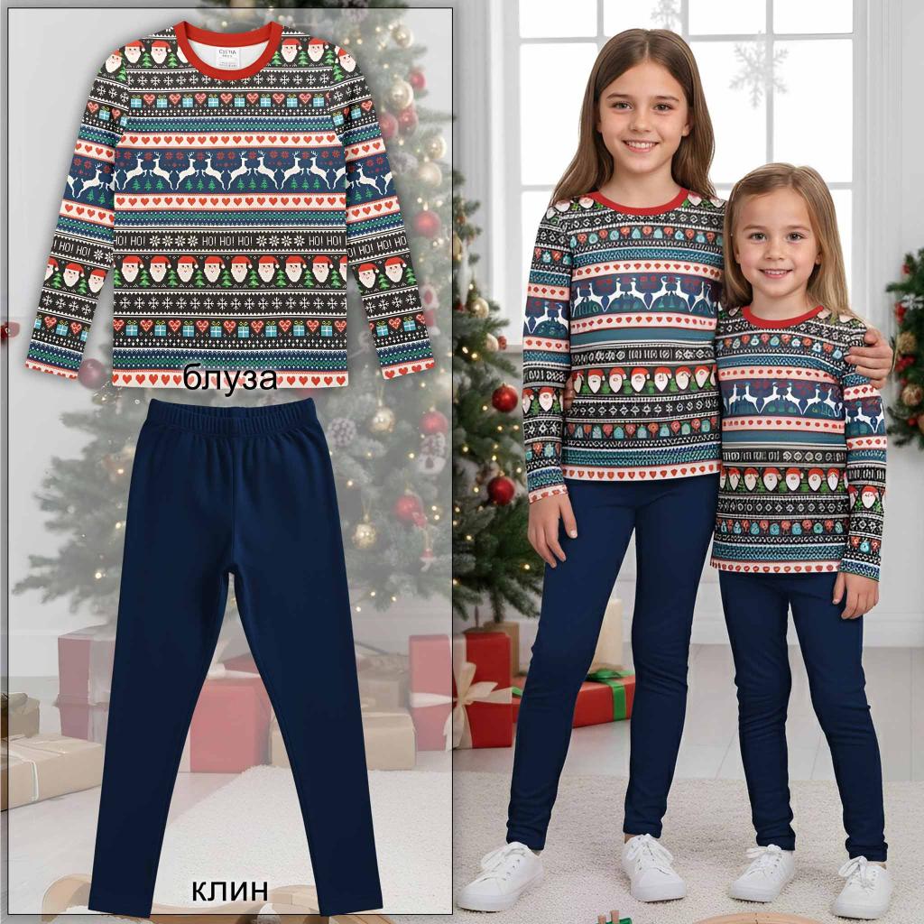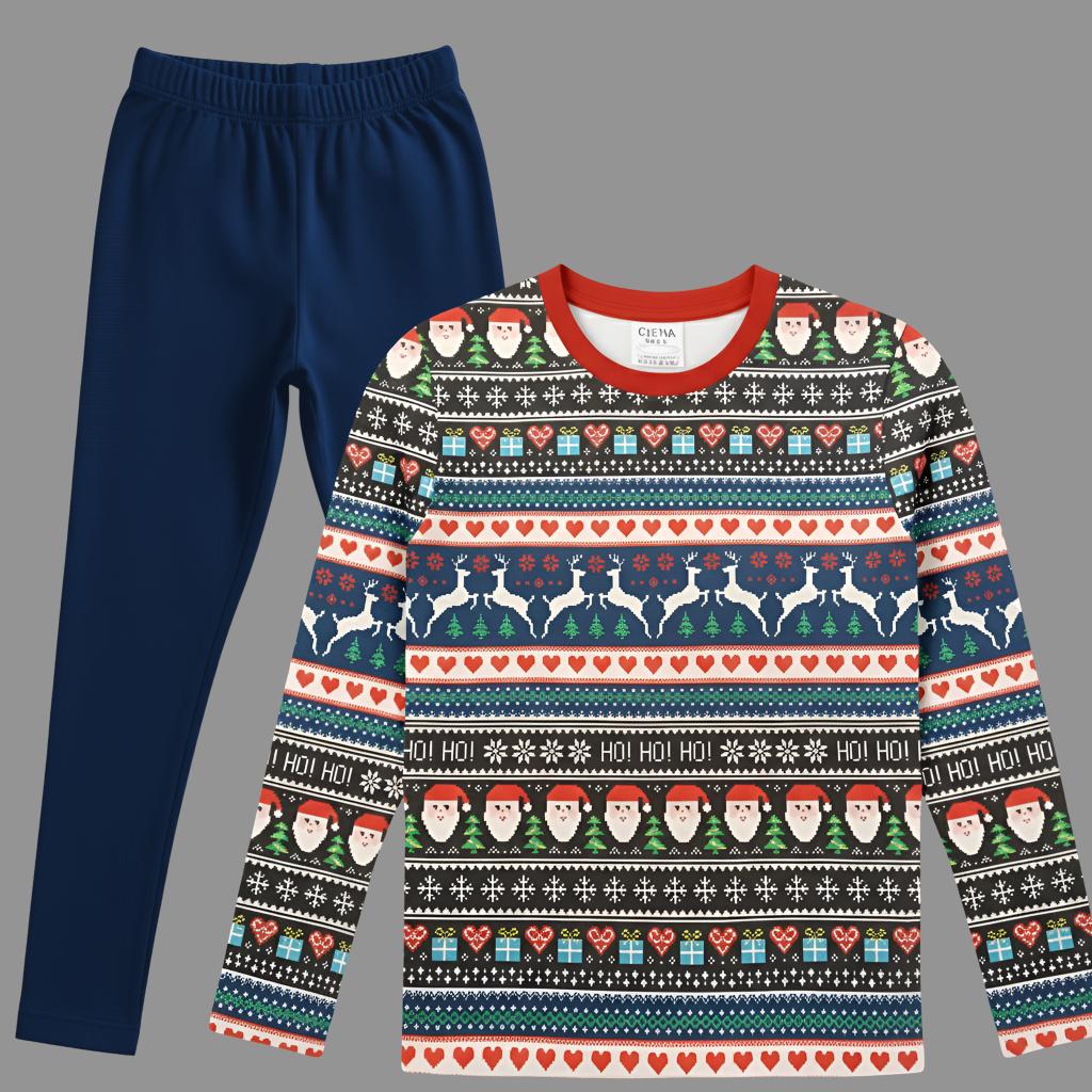 Горнище (Блуза): Дълъг ръкав с цялостен принт, имитиращ плетен коледен пуловер (Fair Isle). Дизайнът е в богата палитра от тъмно синьо, черно, червено, бяло и зелено и е организиран в хоризонтални ивици. Мотивите включват лица на Дядо Коледа, еленчета, елхички, снежинки и надпис "HO! HO! HO!". Деколтето е завършено с контрастен червен щрик.