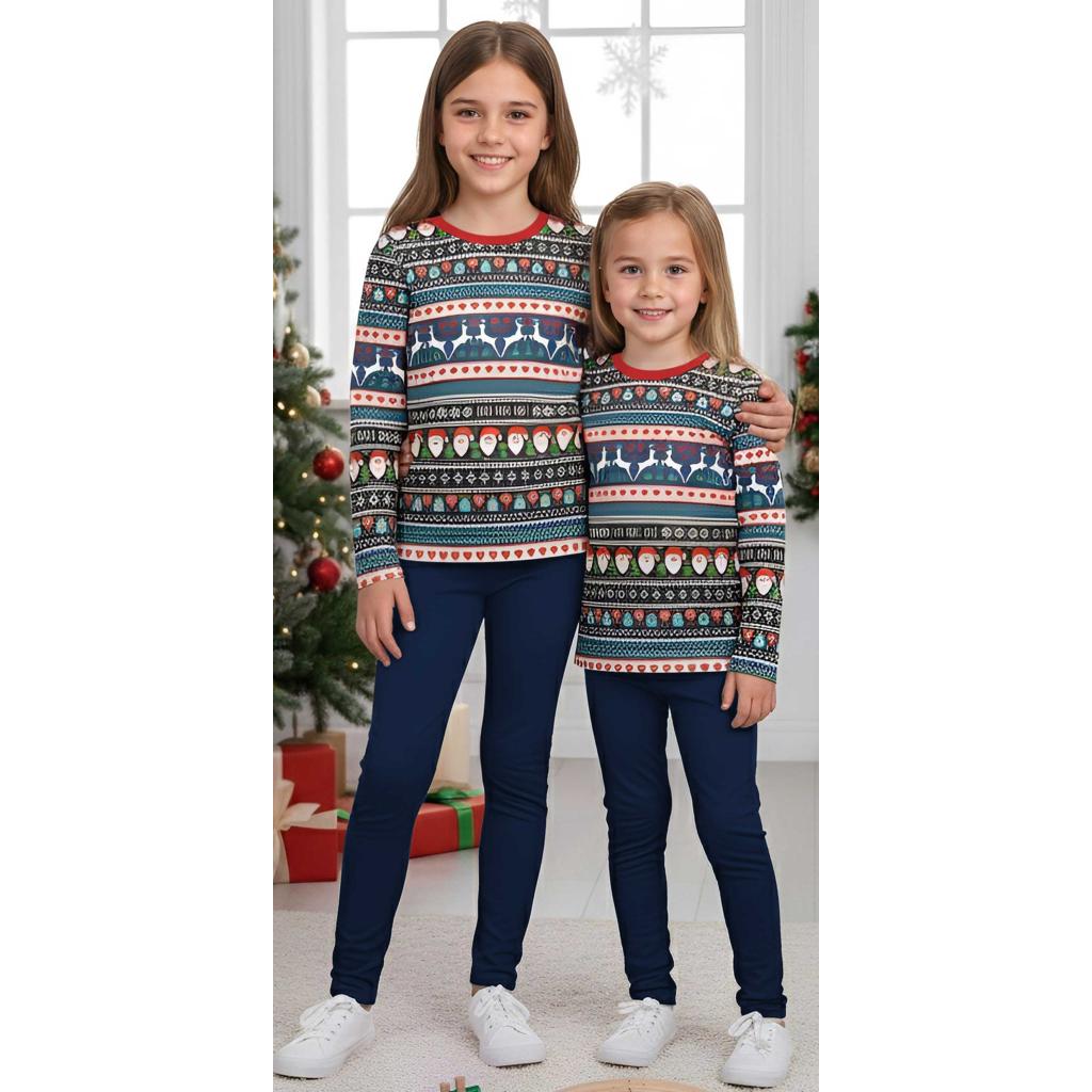 Внесете класически коледен чар и традиционен уют в зимния гардероб на вашето дете! Този комплект съчетава богатия, многоцветен десен на горнището с практично едноцветно долнище, което го прави идеален за всякакви празнични поводи или ежедневен стил.