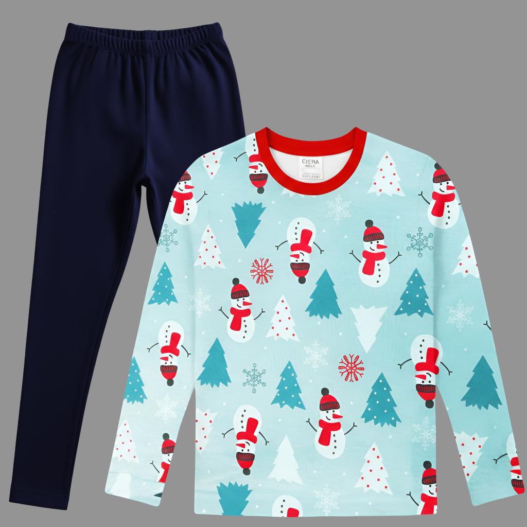 Горнище (Блуза): Дълъг ръкав с цялостен принт на светъл, пастелно син фон. Деколтето е завършено с контрастен червен кант. Принтът е весел и повтарящ се, включващ снежни човеци с червени шапки и шалове, елхички в различни нюанси на синьо и бяло, и снежинки.