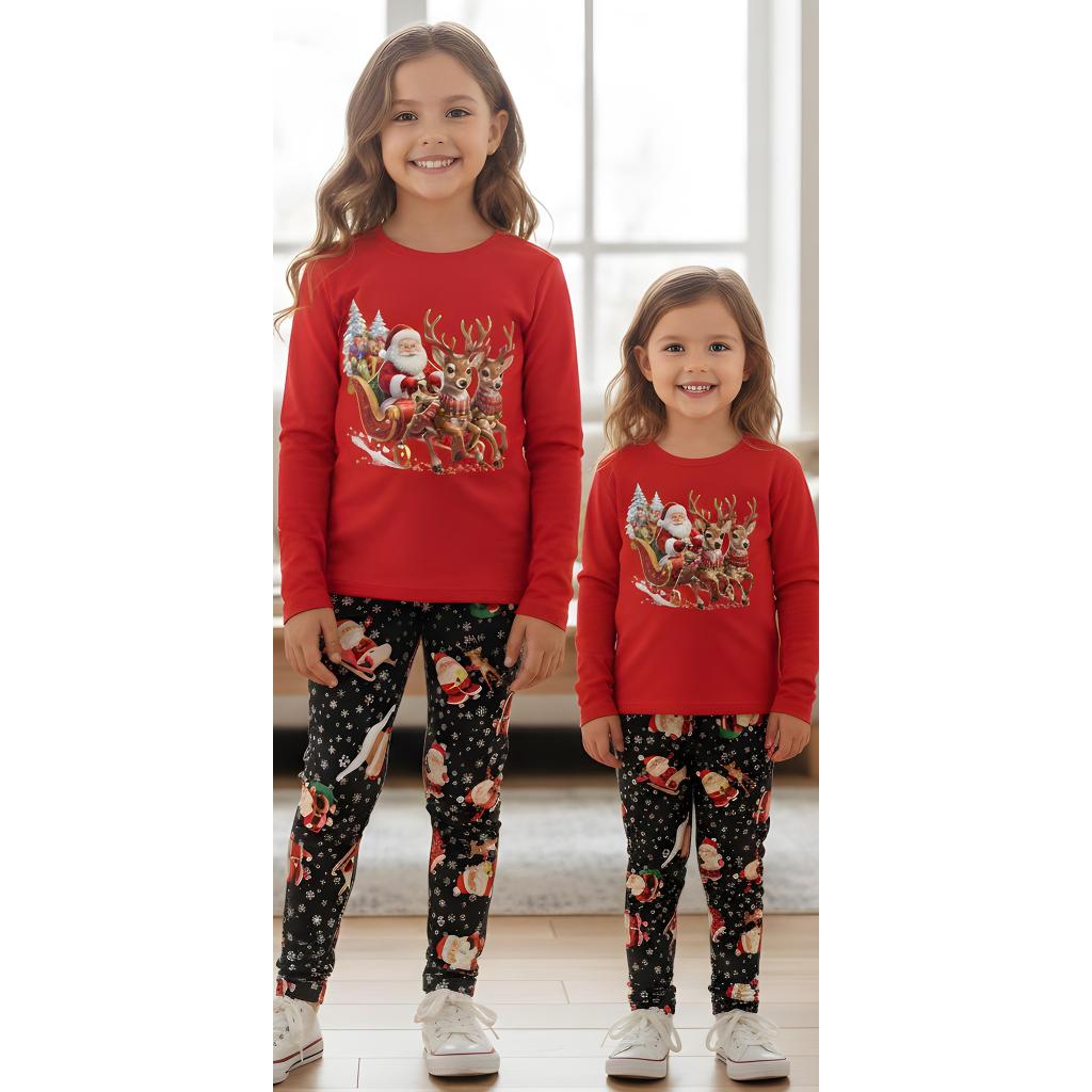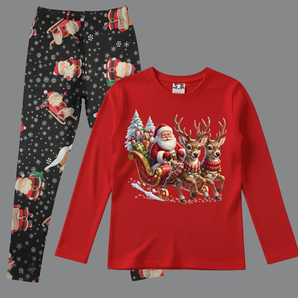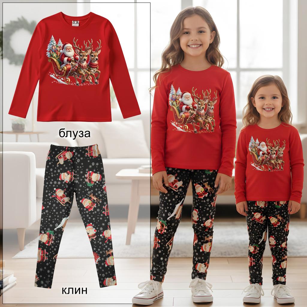 Горнище (Блуза): Дълъг ръкав в наситен празничен червен цвят. Централният принт изобразява Дядо Коледа в шейната си, теглена от две еленчета, облечени в шалове, на фона на коледни елхи и подаръци.