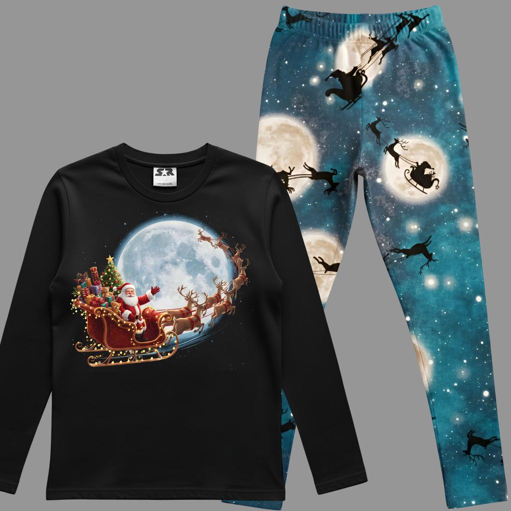 Принт: Централен, голям принт, изобразяващ Дядо Коледа, теглен от елени в шейна, прелитащ пред огромна пълна луна на фона на нощно небе.