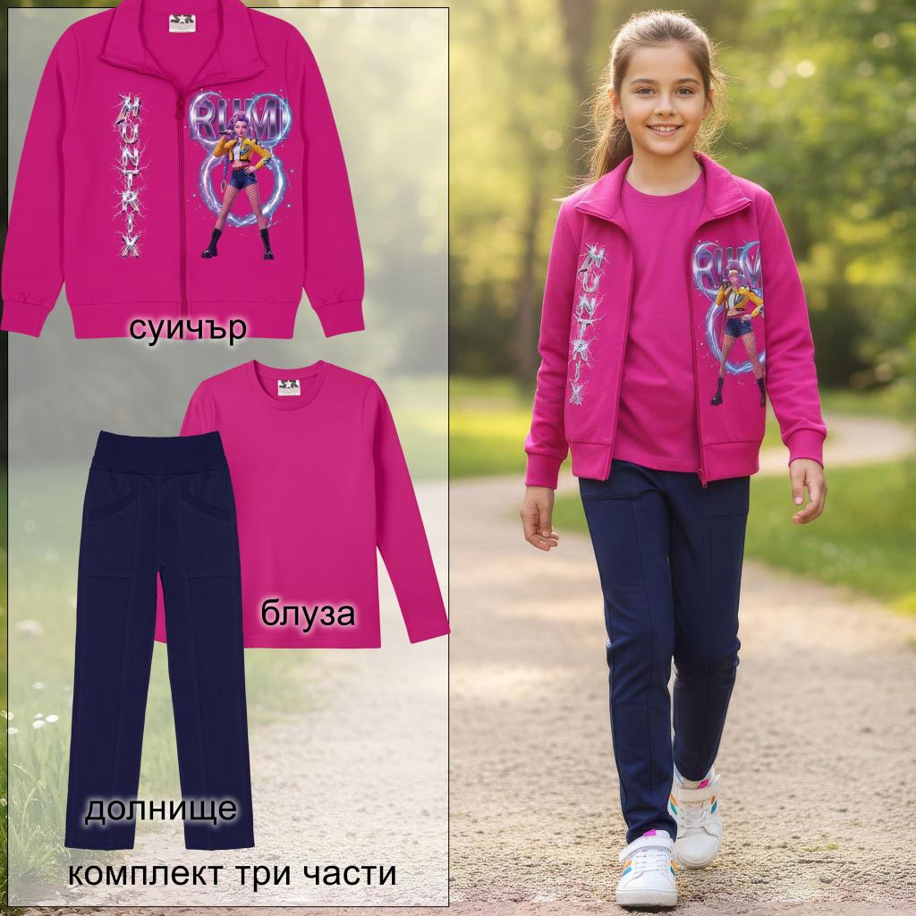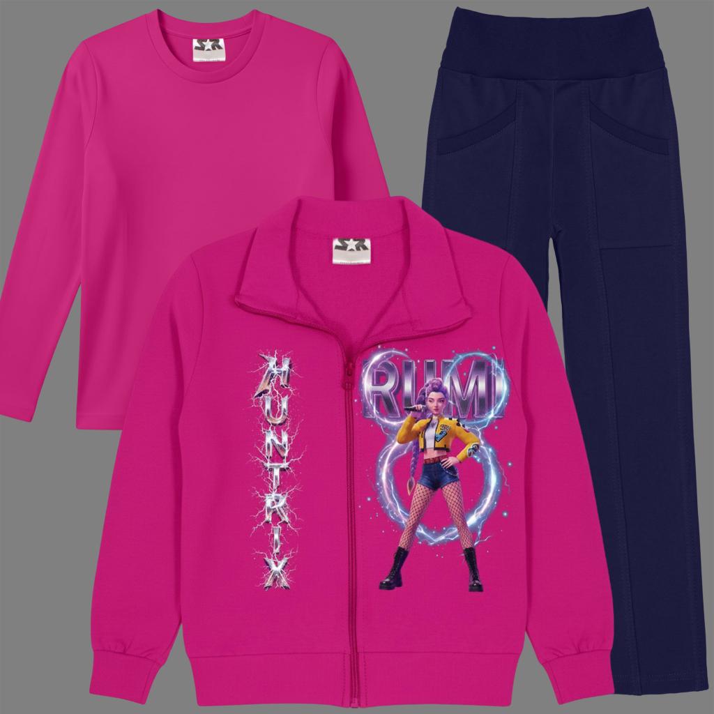 🧥 Суитшърт с Цип/Горнище "RUMI HUNTRIX" (Циклама): Яке с яка и цип, което придава завършен, спортен вид. Големият принт на RUMI и вертикалният надпис "HUNTRIX" носят енергия и уникален K-pop стил. Перфектен за наслояване.