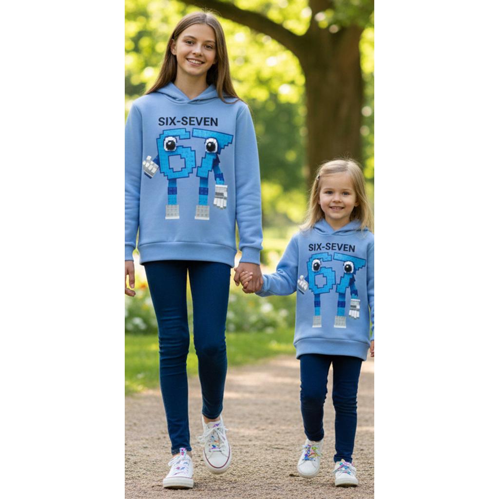 Светлосиният суичър с качулка грабва погледа с веселия герой „Six-Seven“, който изглежда сякаш е сглобен от любими кубчета и е готов за игри, смях и приключения.