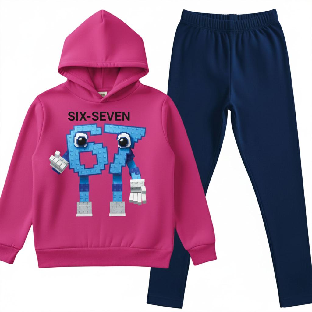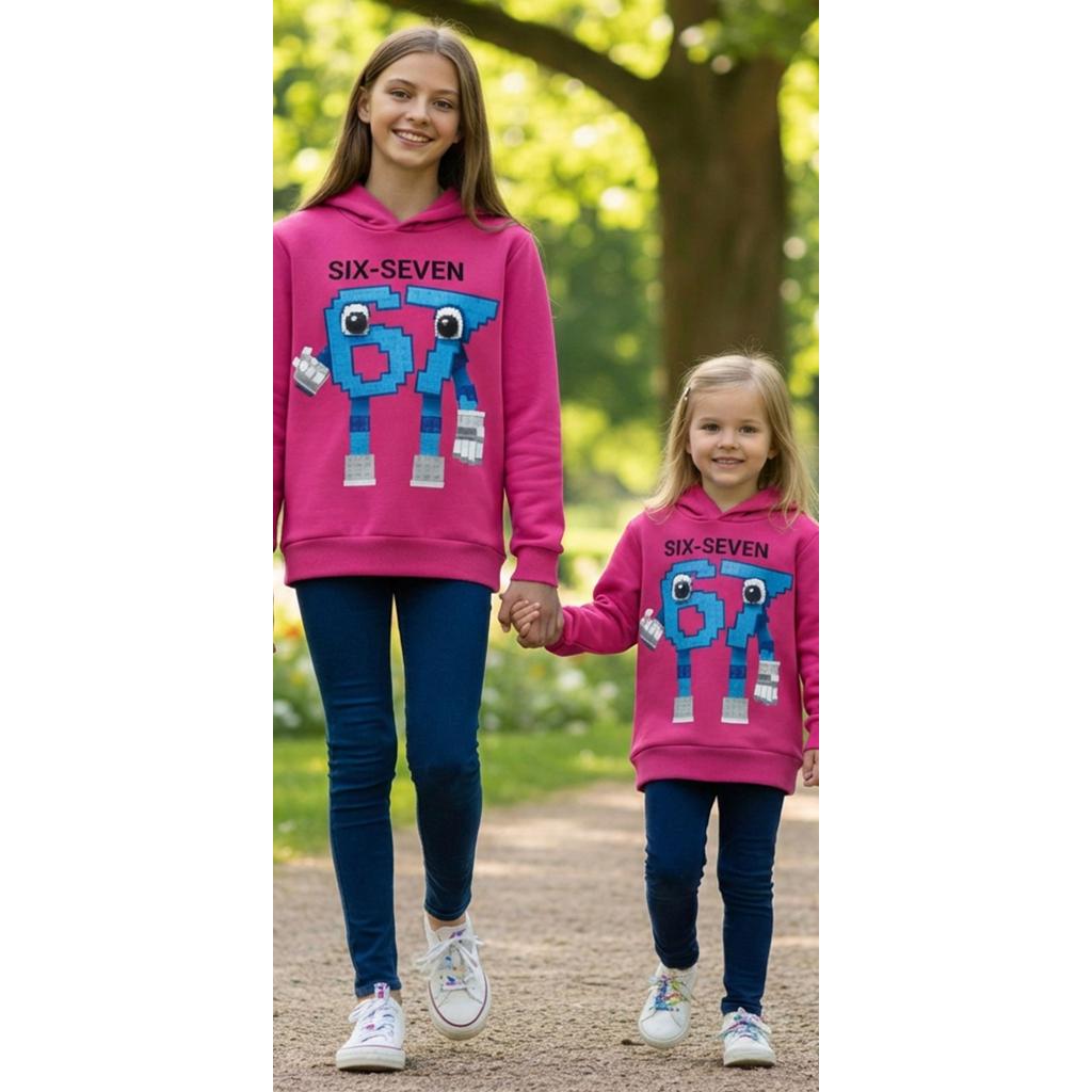 Светлосиният суичър с качулка грабва погледа с веселия герой „Six-Seven“, който изглежда сякаш е сглобен от любими кубчета и е готов за игри, смях и приключения.