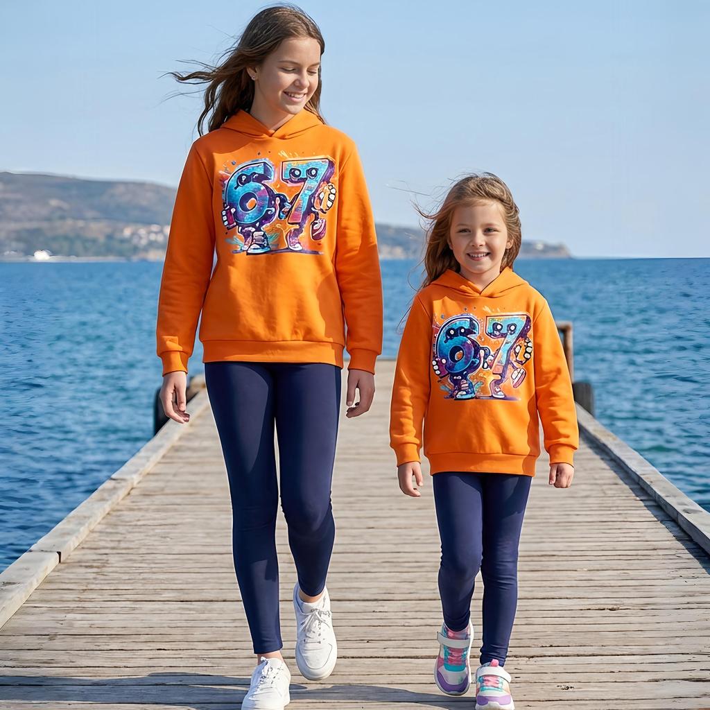 Визуален баланс: Яркият оранжев суичър привлича вниманието нагоре, докато тъмният клин (черен или графит) придава завършеност и елегантност на силуета.