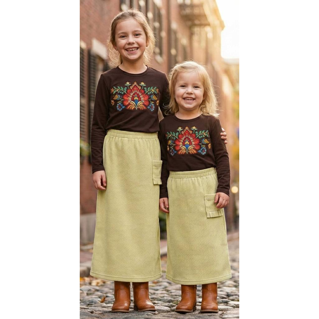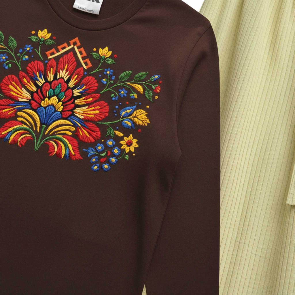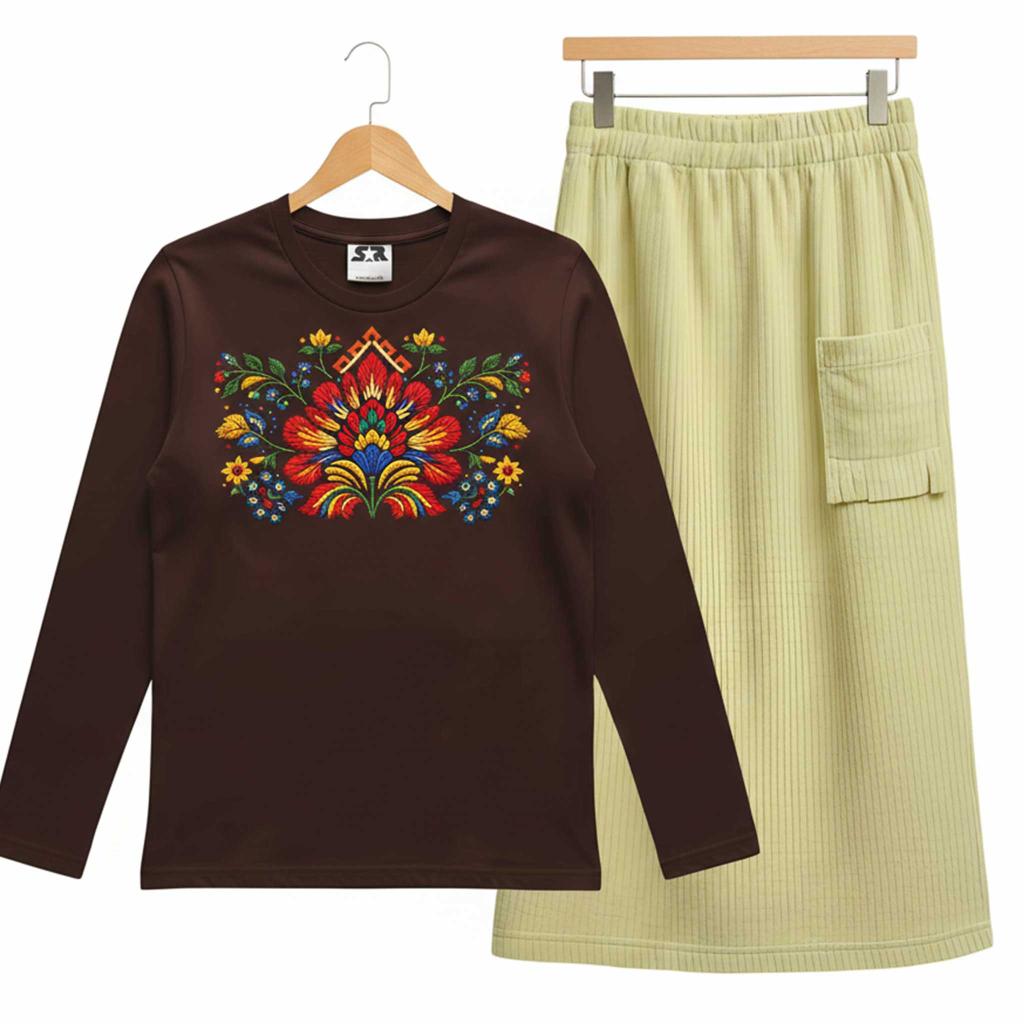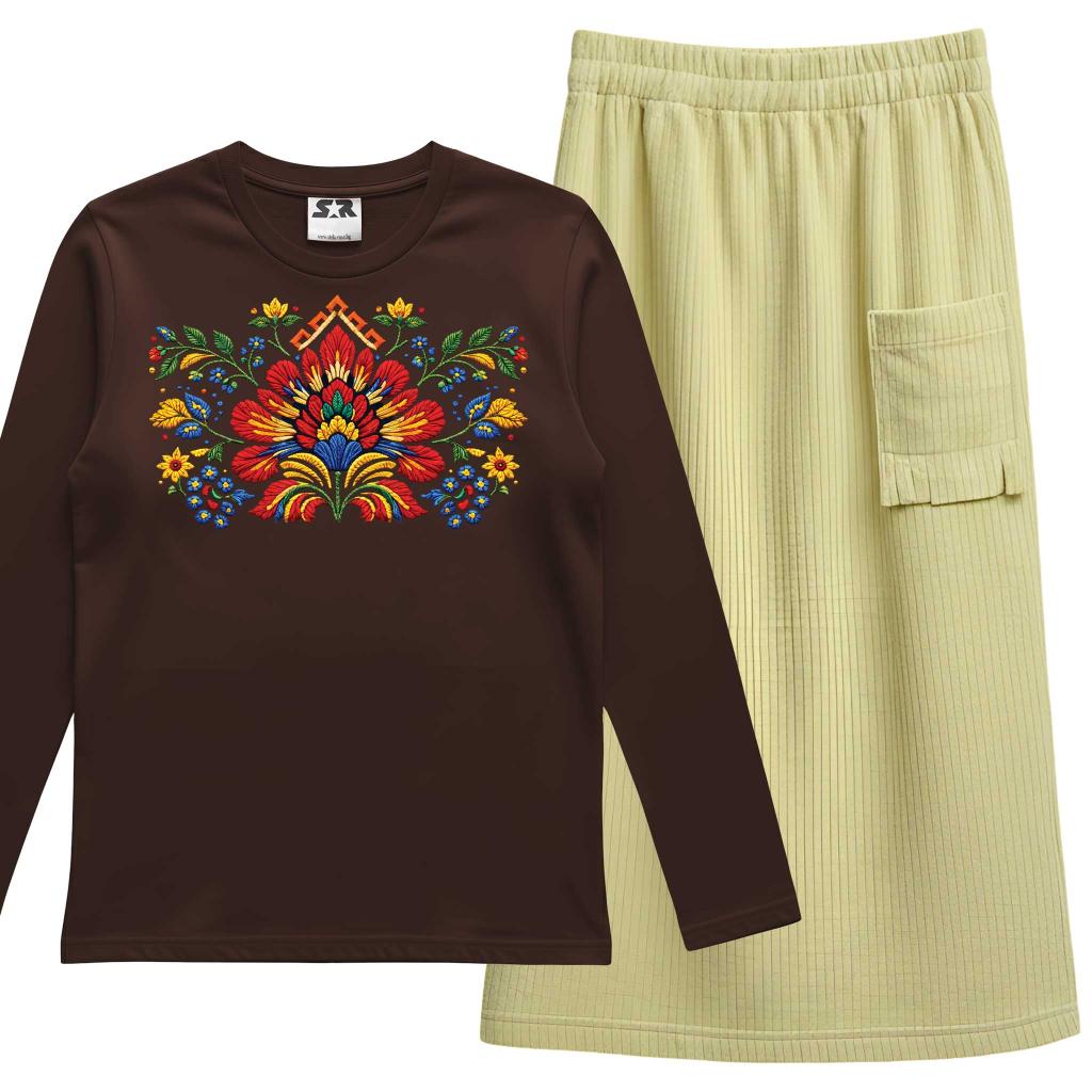 Блузата в топъл кафяв цвят е акцентът – с пъстър фолклорен принт, който носи духа на традицията. Комбинирана с нежна бежова пола с релефна текстура и практичен джоб, визията става елегантна, уютна и много стилна.