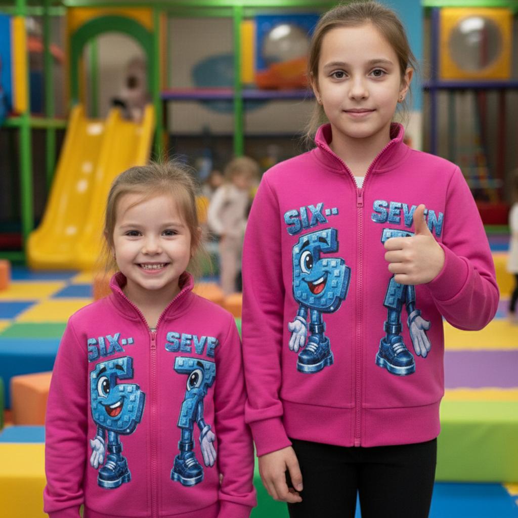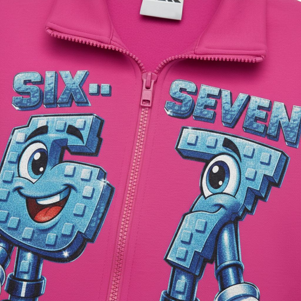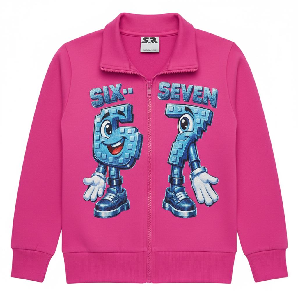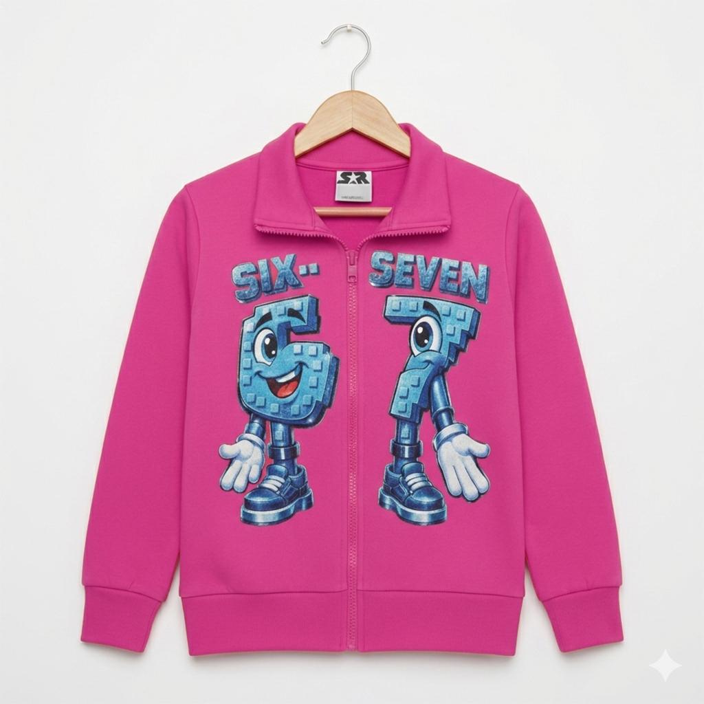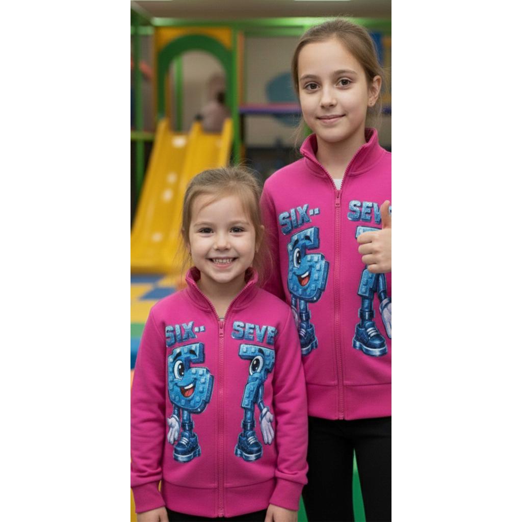 Ярък, модерен и изпълнен с настроение – този детски суичър в наситен цикламен цвят впечатлява с атрактивния принт „Six-Seven“. Усмихнатите цифри 6 и 7 придават игрив характер и правят модела любим на децата.