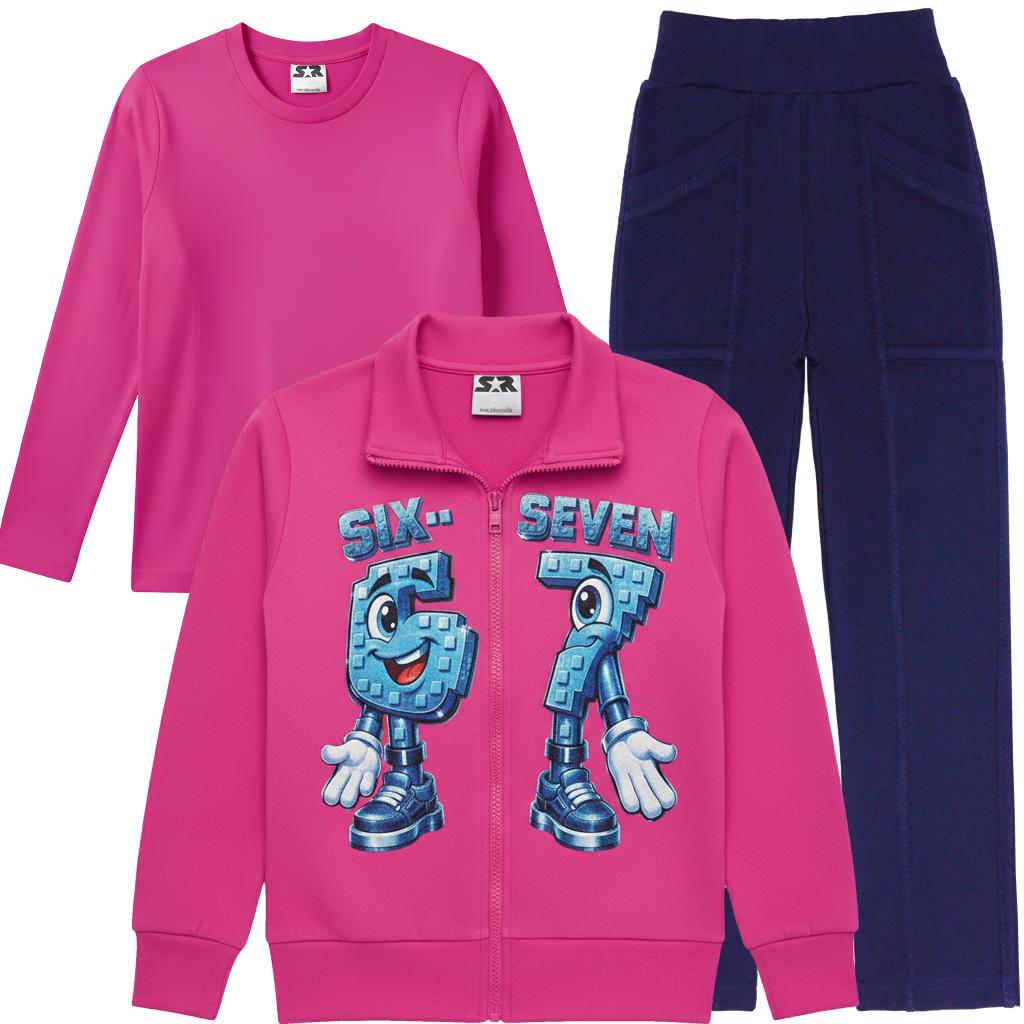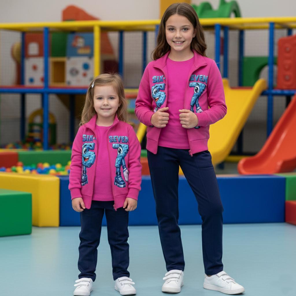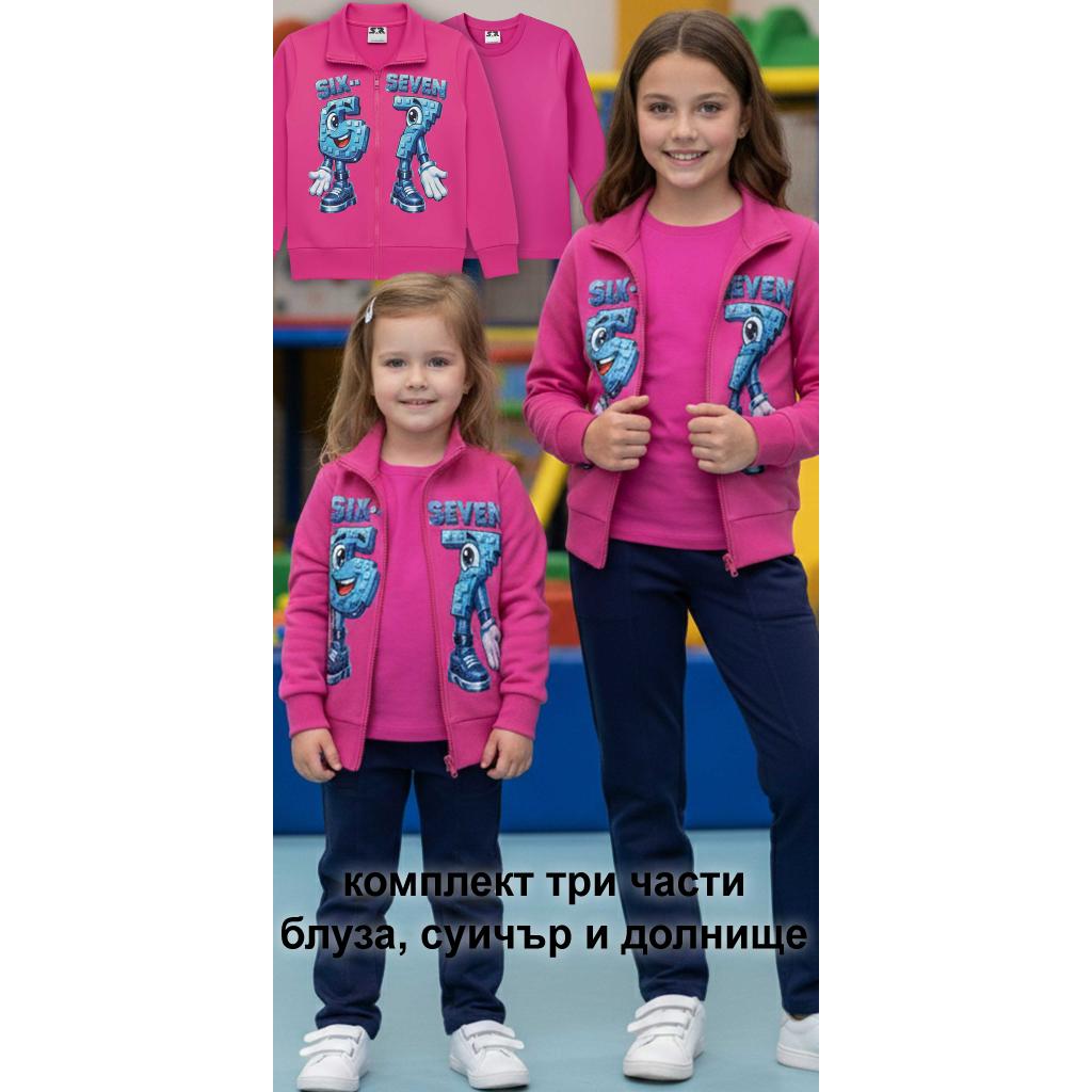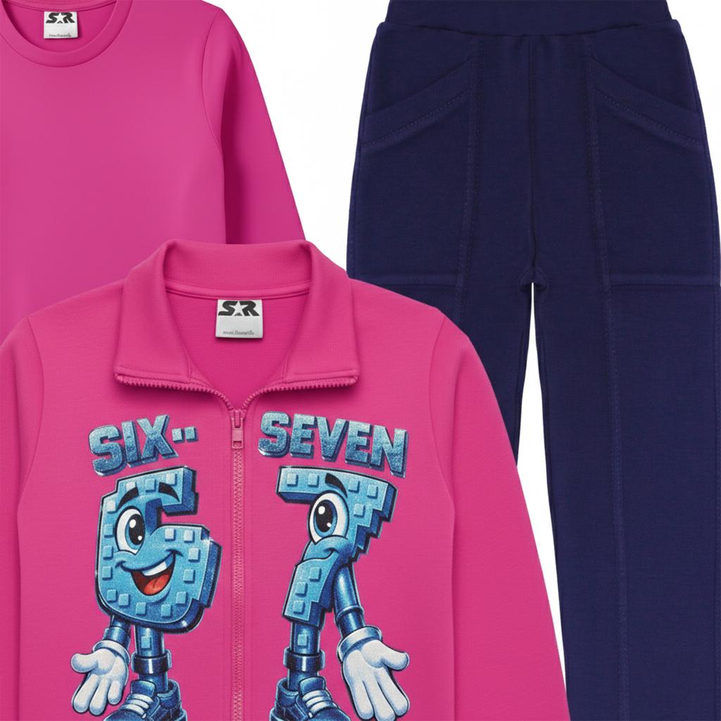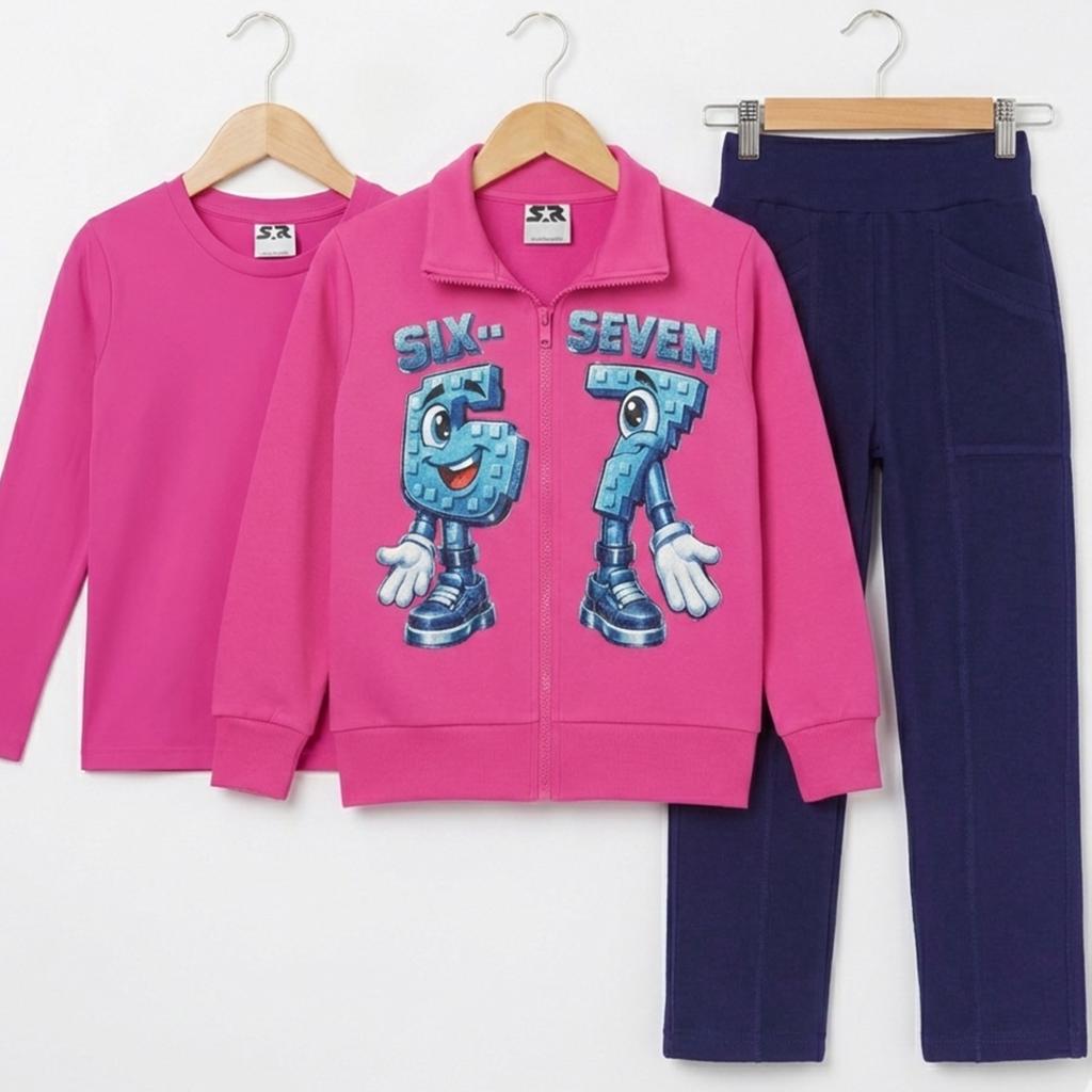 Ярък, удобен и практичен комплект, създаден за активното ежедневие на децата. Цикламеният суичър с цип и атрактивен принт „Six-Seven“ се комбинира с тъмно спортно панталонче и едноцветна блуза в същия цикламен тон за завършена и функционална визия.