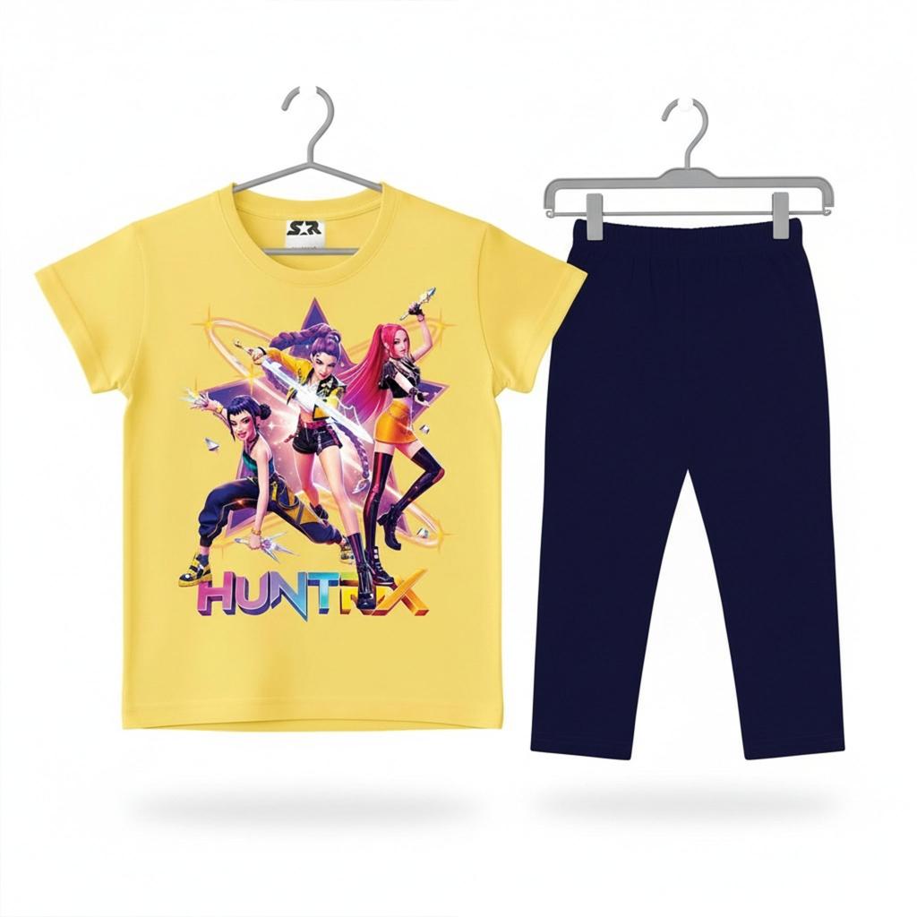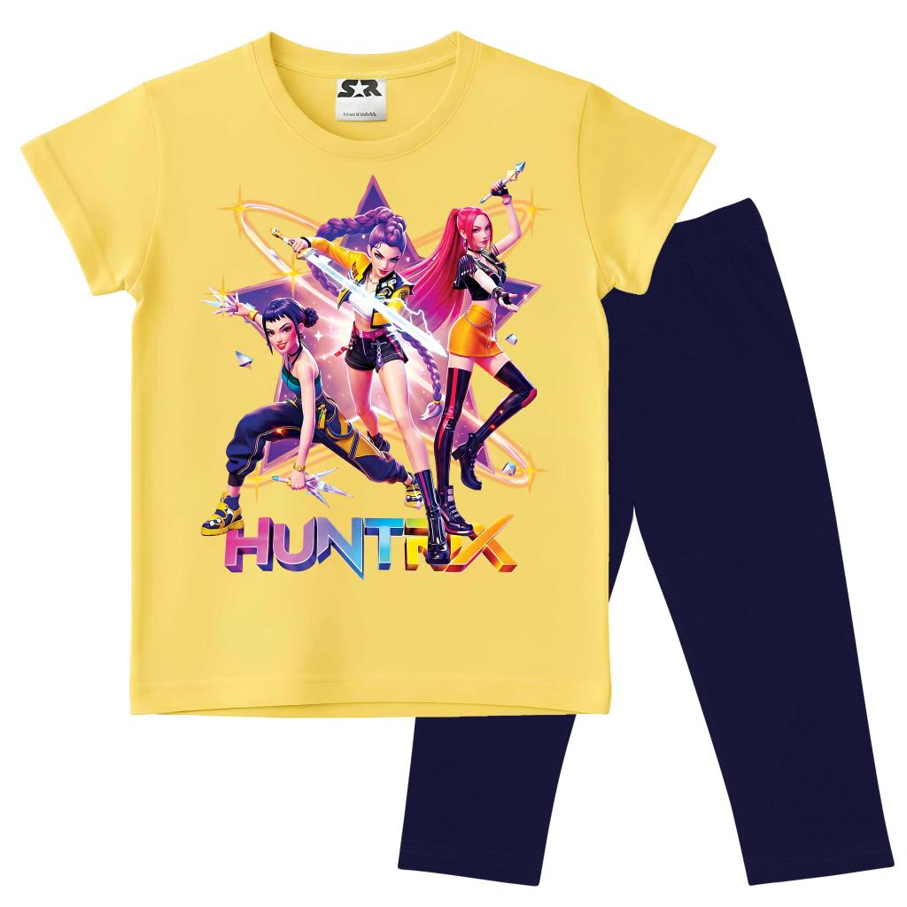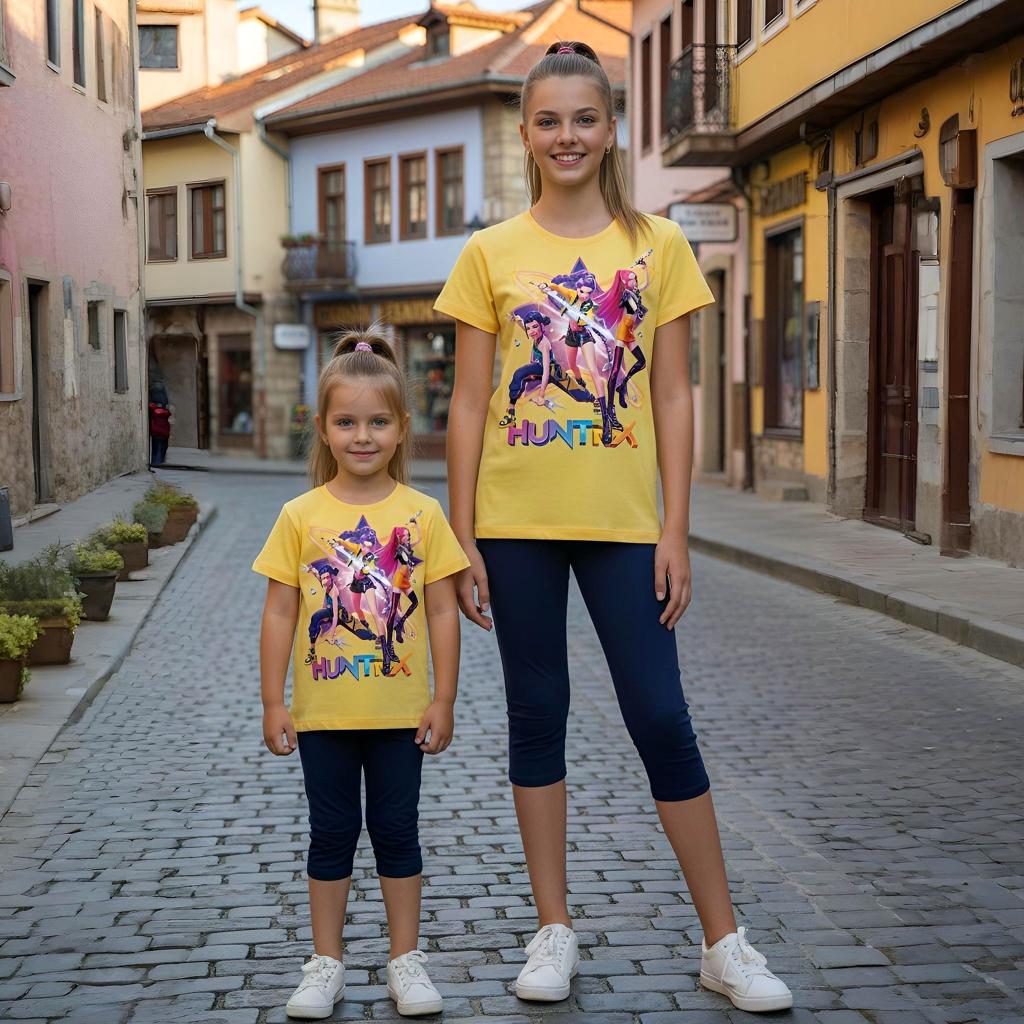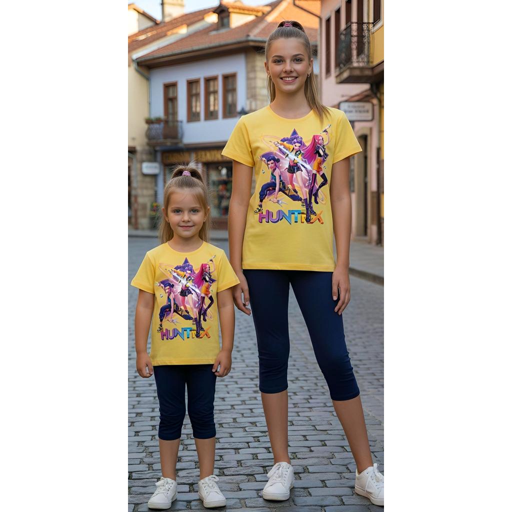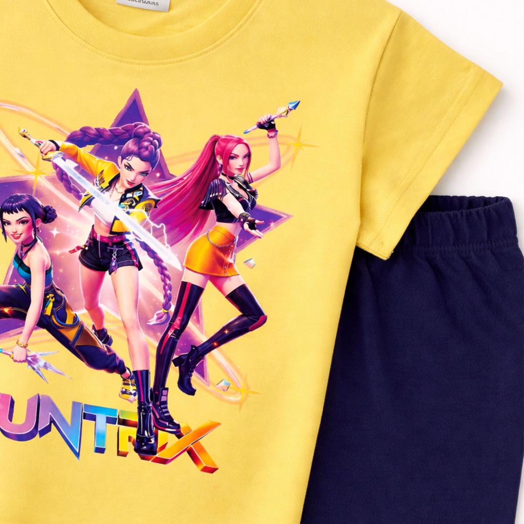 Ярката жълта тениска със сценичен K-POP принт среща тъмен клин под коляното и резултатът е готова визия със звезден ефект.