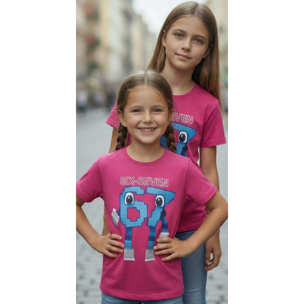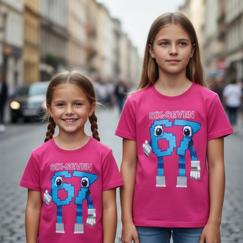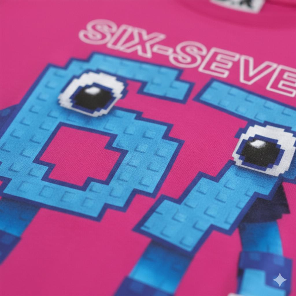 В центъра е забавният герой „67“, изграден в интересен пиксел-игрален стил с големи очи и усмивка, който създава усещане за игра, технологии и приключение. Надписът SIX-SEVEN допълва дизайна и придава модерен, динамичен характер.
