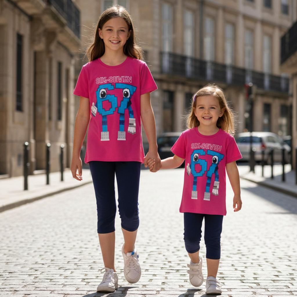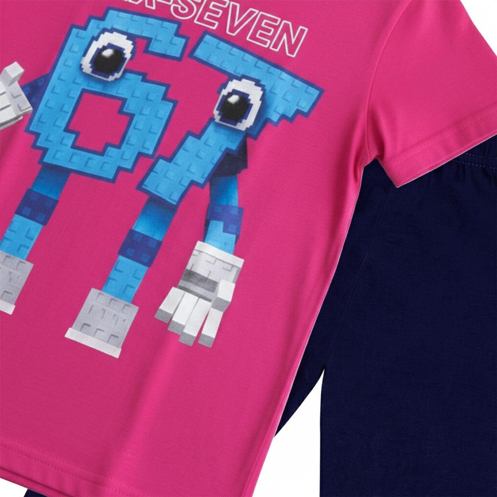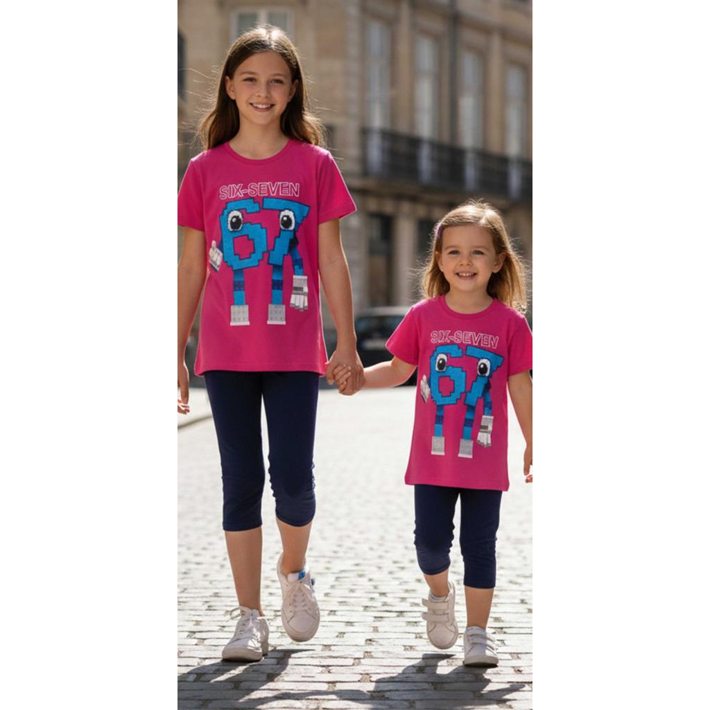 Цикламената тениска с игривия герой „67“ в пиксел стил създава усещане за игра, настроение и детско приключение. Големите очи и забавната визия правят дизайна любим на децата, а модерният надпис SIX-SEVEN добавя още повече стил.