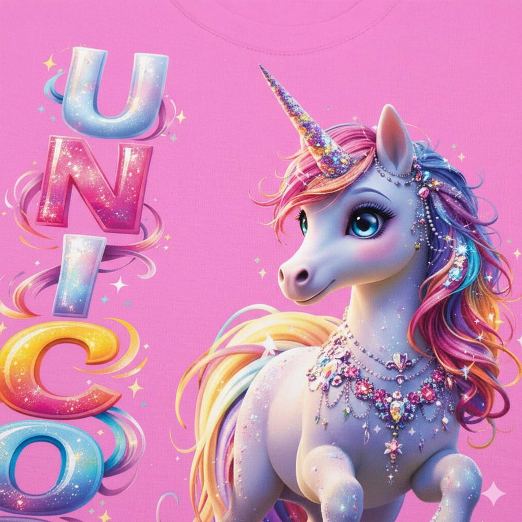 Надписът UNICORN в пъстри цветове допълва приказната визия и прави тениската още по-атрактивна и модерна. Дизайнът е създаден с висококачествен DTF печат, който запазва ярките цветове красиви и устойчиви дори след много пранета.