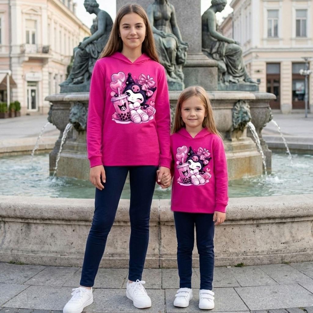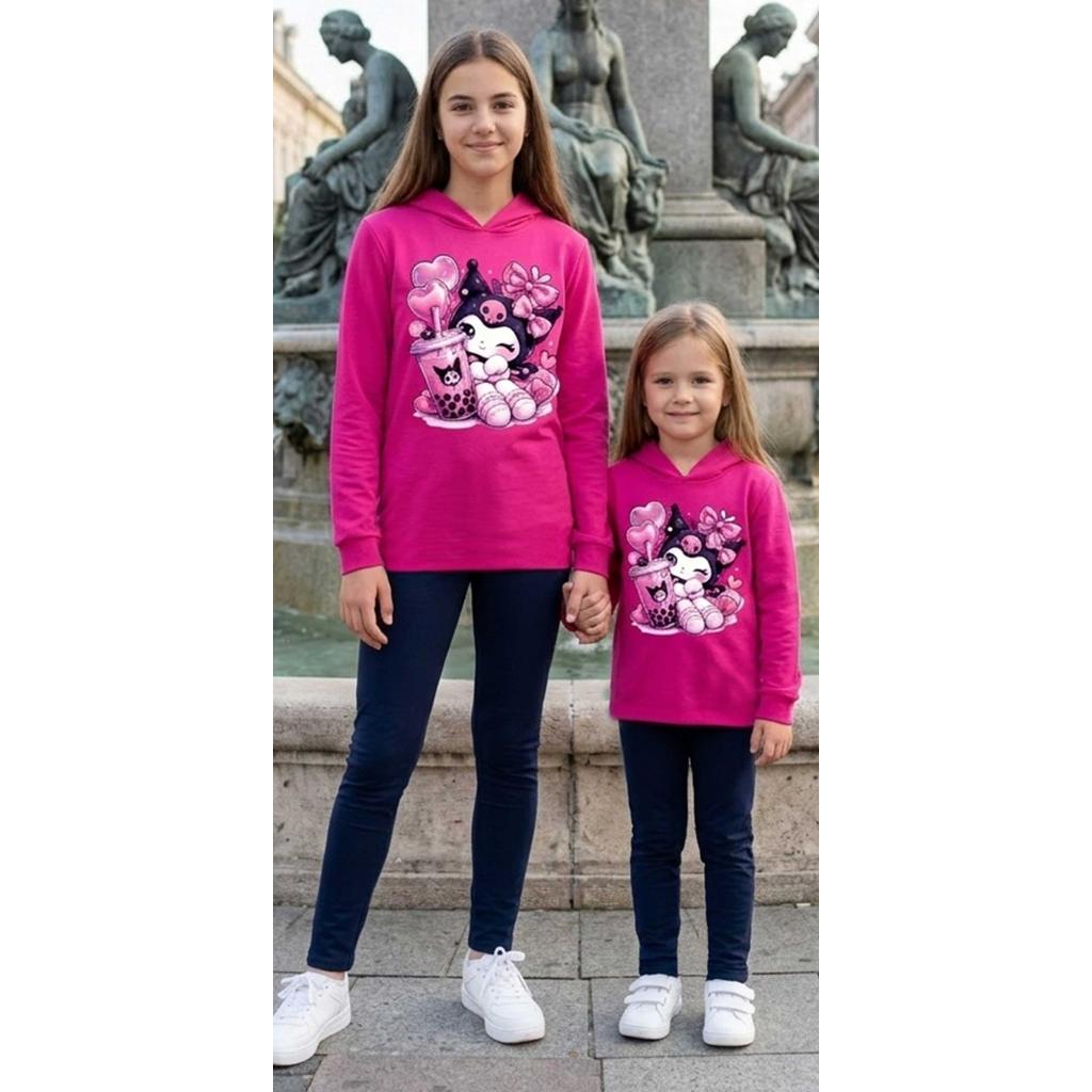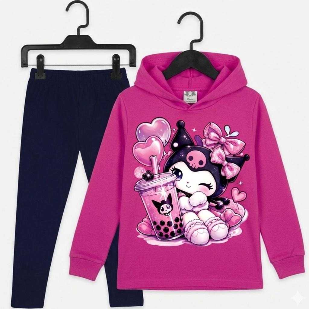Стилен, сладък и много модерен комплект за момичета, които обичат любимия герой Kuromi. Комплектът съчетава цикламена тънка блуза с качулка и удобен тъмен клин, които заедно създават модерна и практична визия за всеки ден.
