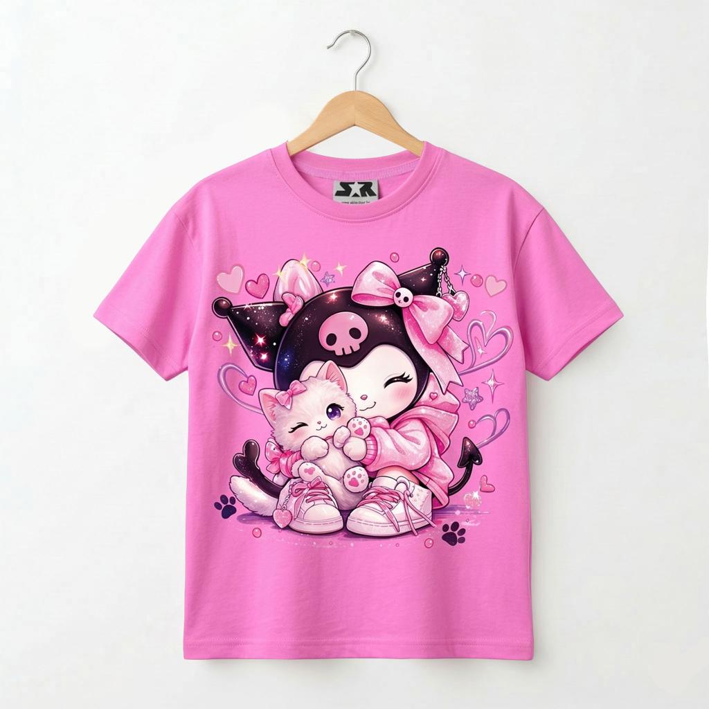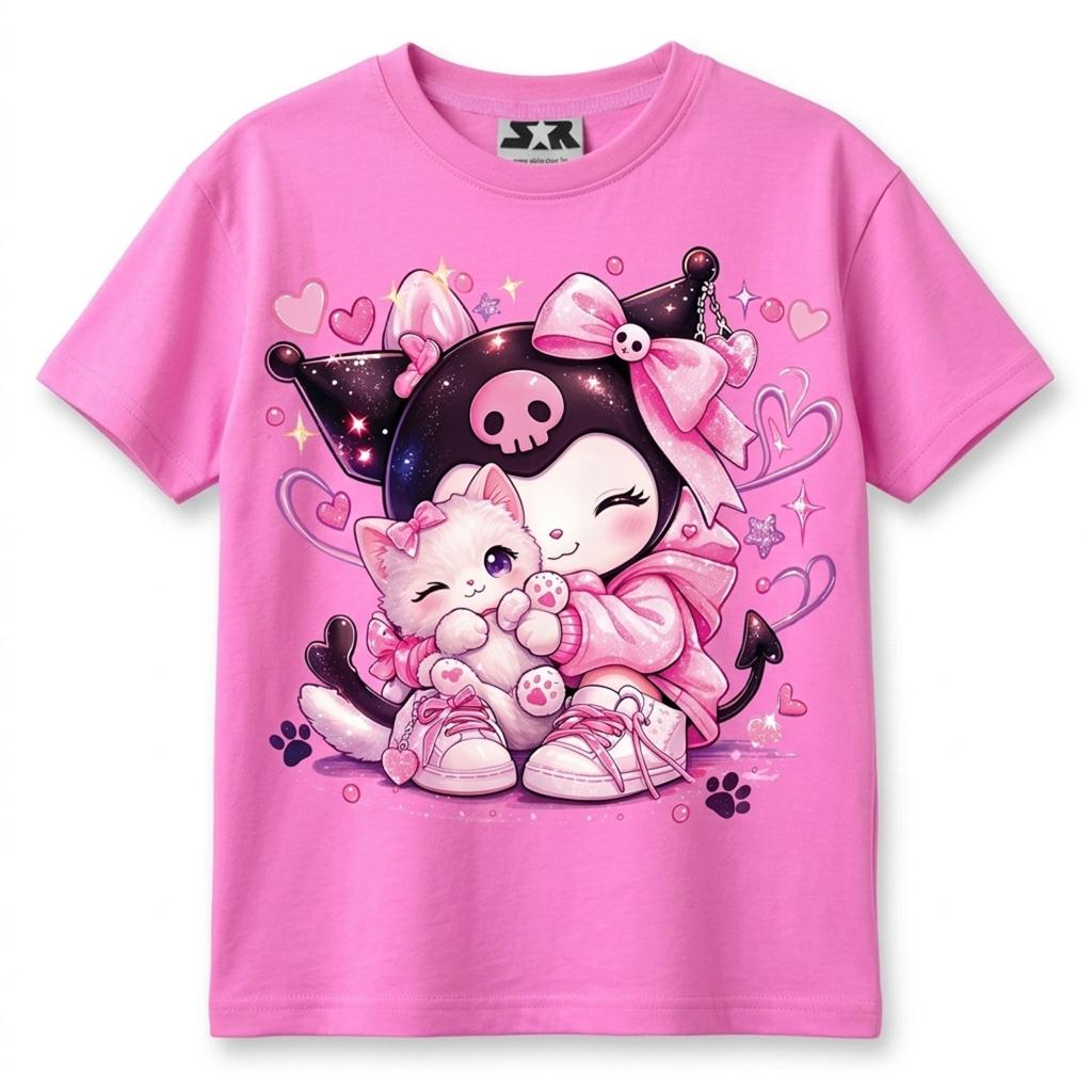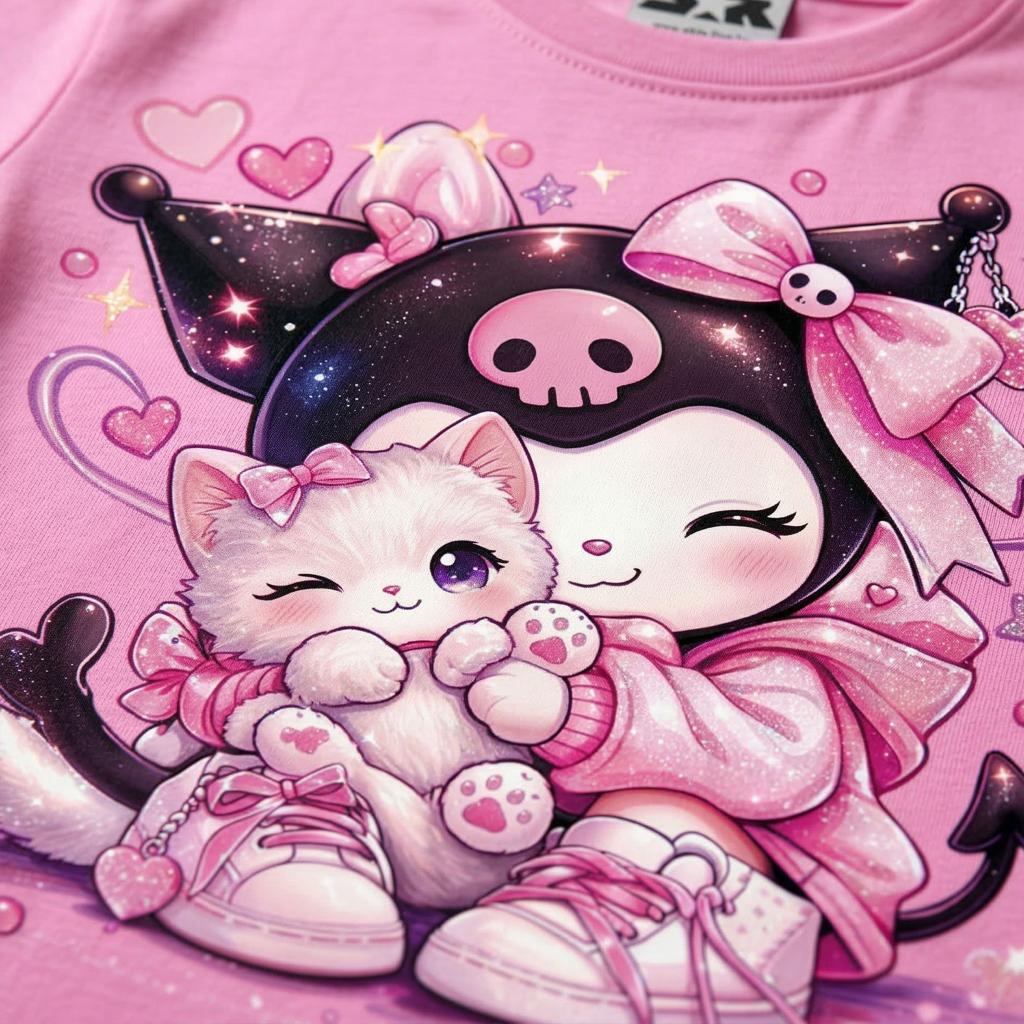 Очарователна детска тениска в нежен розов цвят с любимия герой Kuromi, която веднага привлича вниманието. Веселият дизайн показва Kuromi, прегърнала сладко котенце, заобиколена от сърчица, бляскави детайли и игриви елементи, които създават истинско настроение.