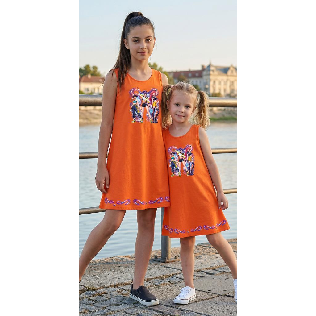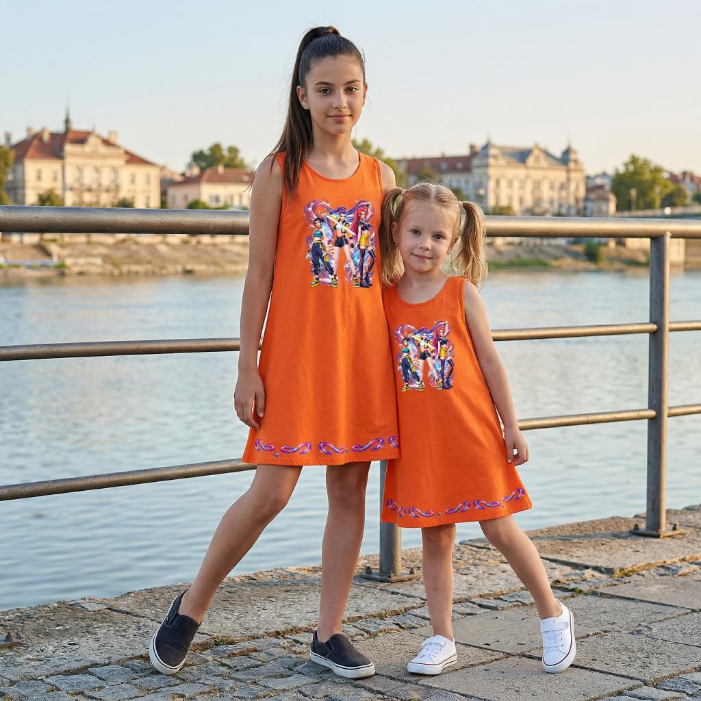 Отпред роклята е украсена с красива и цветна илюстрация с DTF печат, която привлича вниманието и носи настроение. В долната част по целия край има редуващи се малки картинки от същата тематика, които създават завършен и ефектен дизайн – истинска приказка в движение!