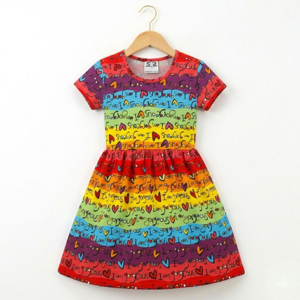 👗 Рокля с цветни райета и надписи – свежа и модерна визия, която комбинира ярки цветове и закачливи послания. Дизайнът с надпис „I am gorgeous“ носи настроение и увереност, а пъстрите нюанси превръщат всяка поява в истинско шоу!
