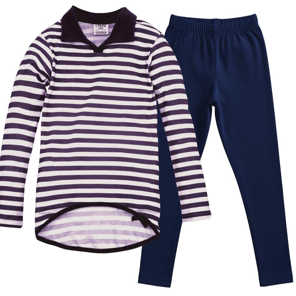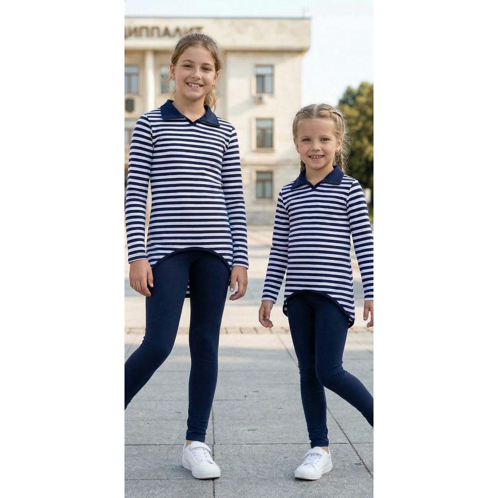 👗 Туника с райе + клин – класическа комбинация в тъмносиньо и бяло, вдъхновена от морската тематика. Туниката е с яка и дълъг ръкав, а клинът е в тъмносин цвят – перфектен баланс между комфорт и елегантност.
